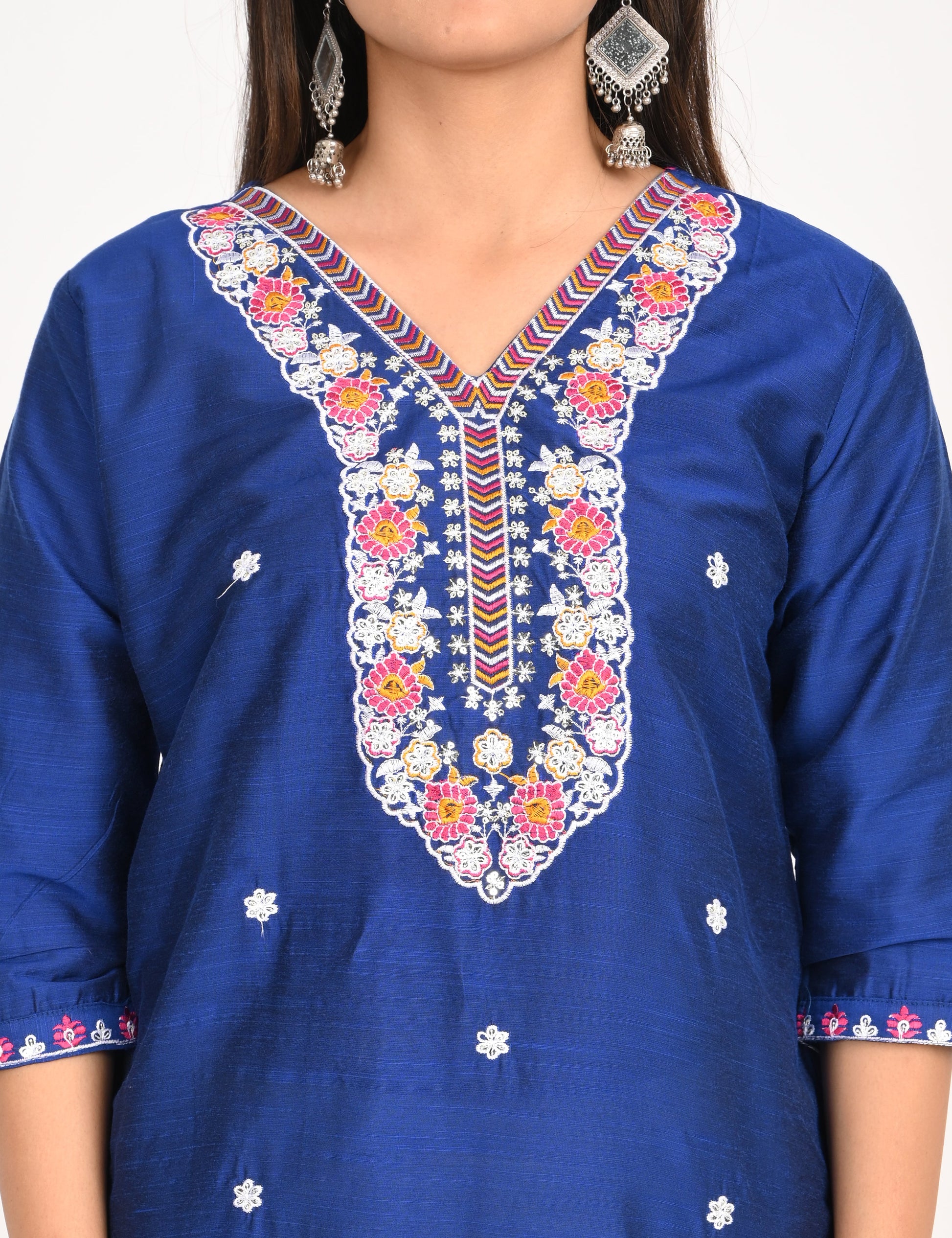 The kurti is adorned with subtle, intricate embroidery that adds a touch of grace and refinement. The small embroidery patterns are thoughtfully placed, creating a harmonious balance that enhances the overall design without overwhelming its simplicity. This design approach makes it versatile, suitable for festive gatherings, casual outings, or even formal office wear.