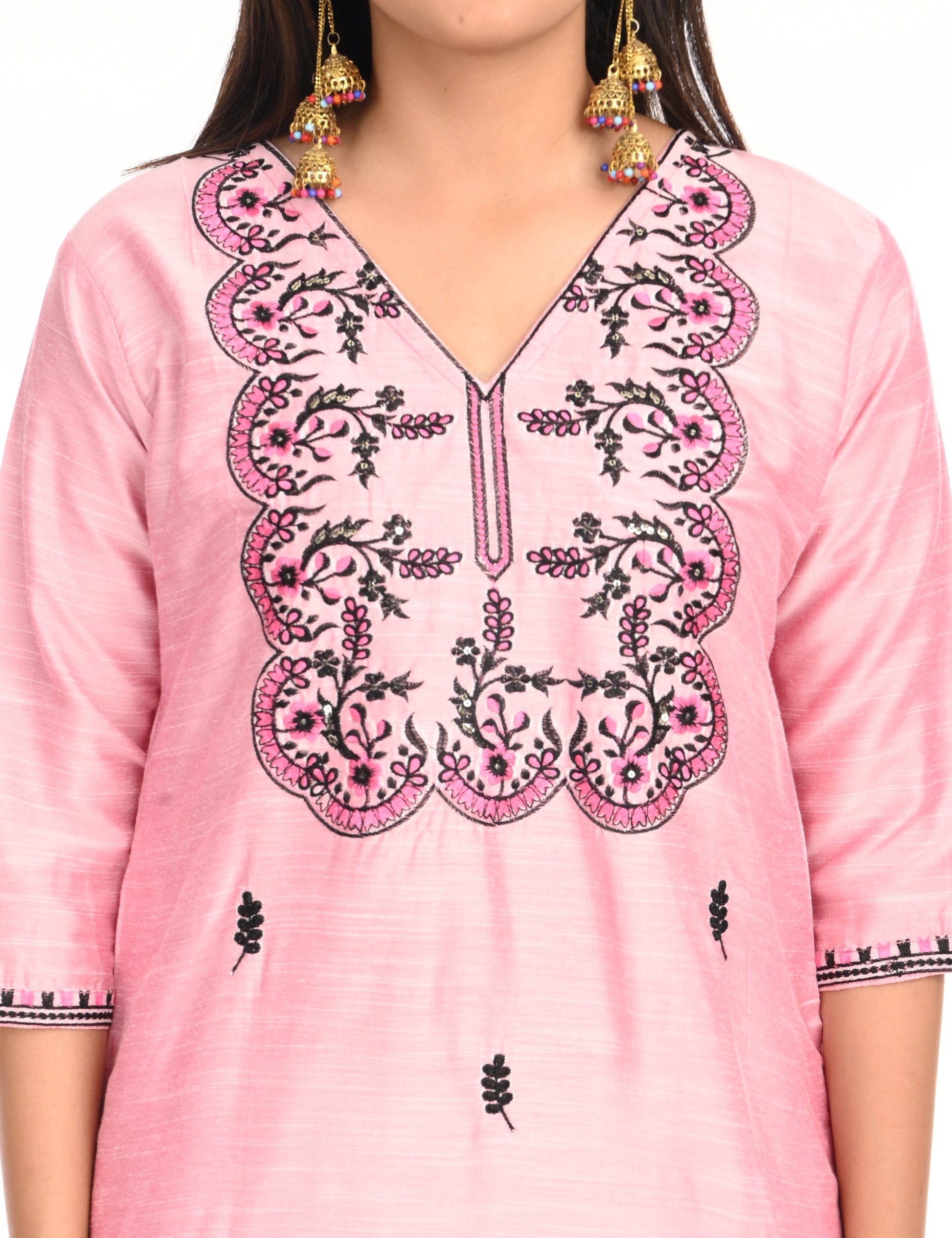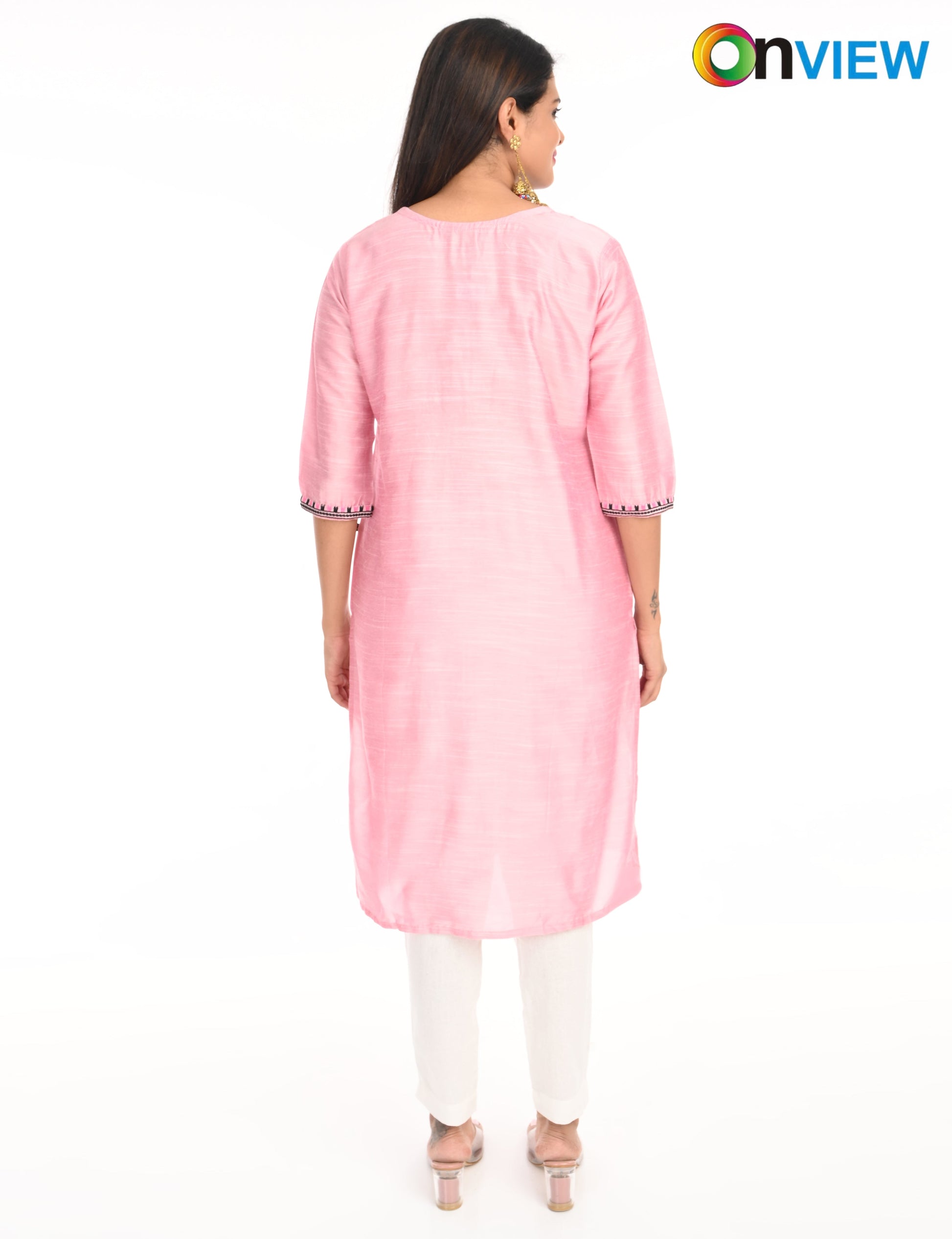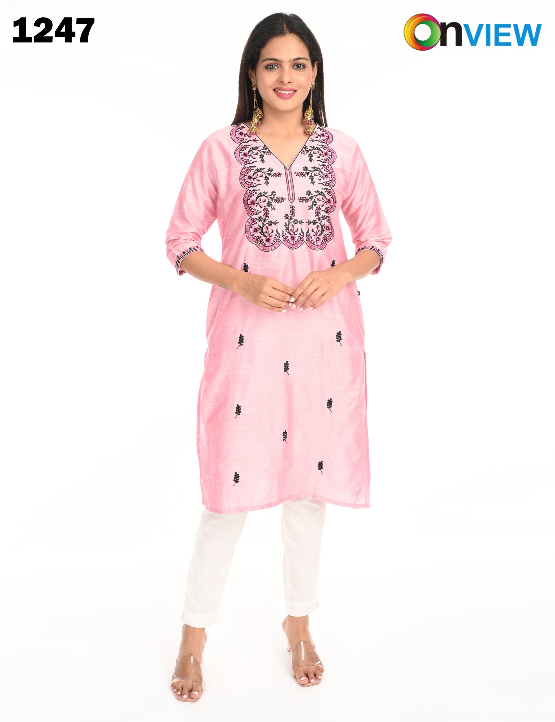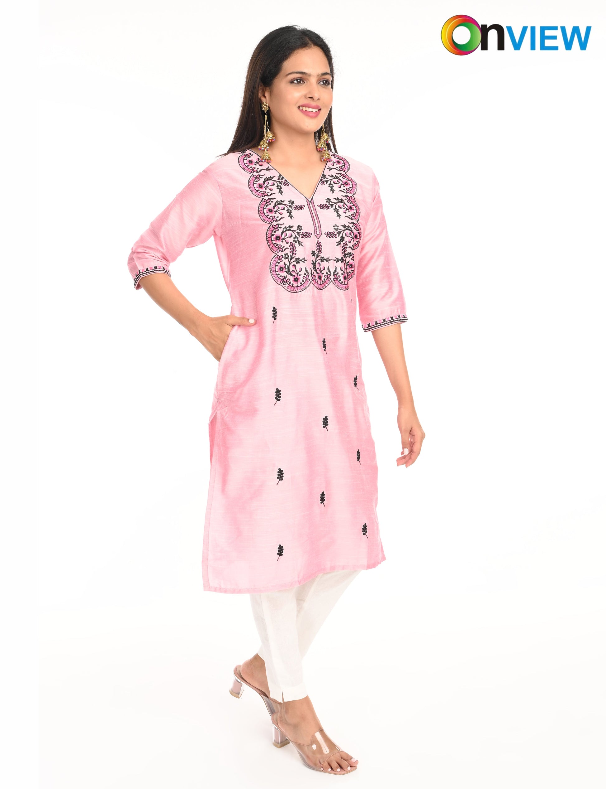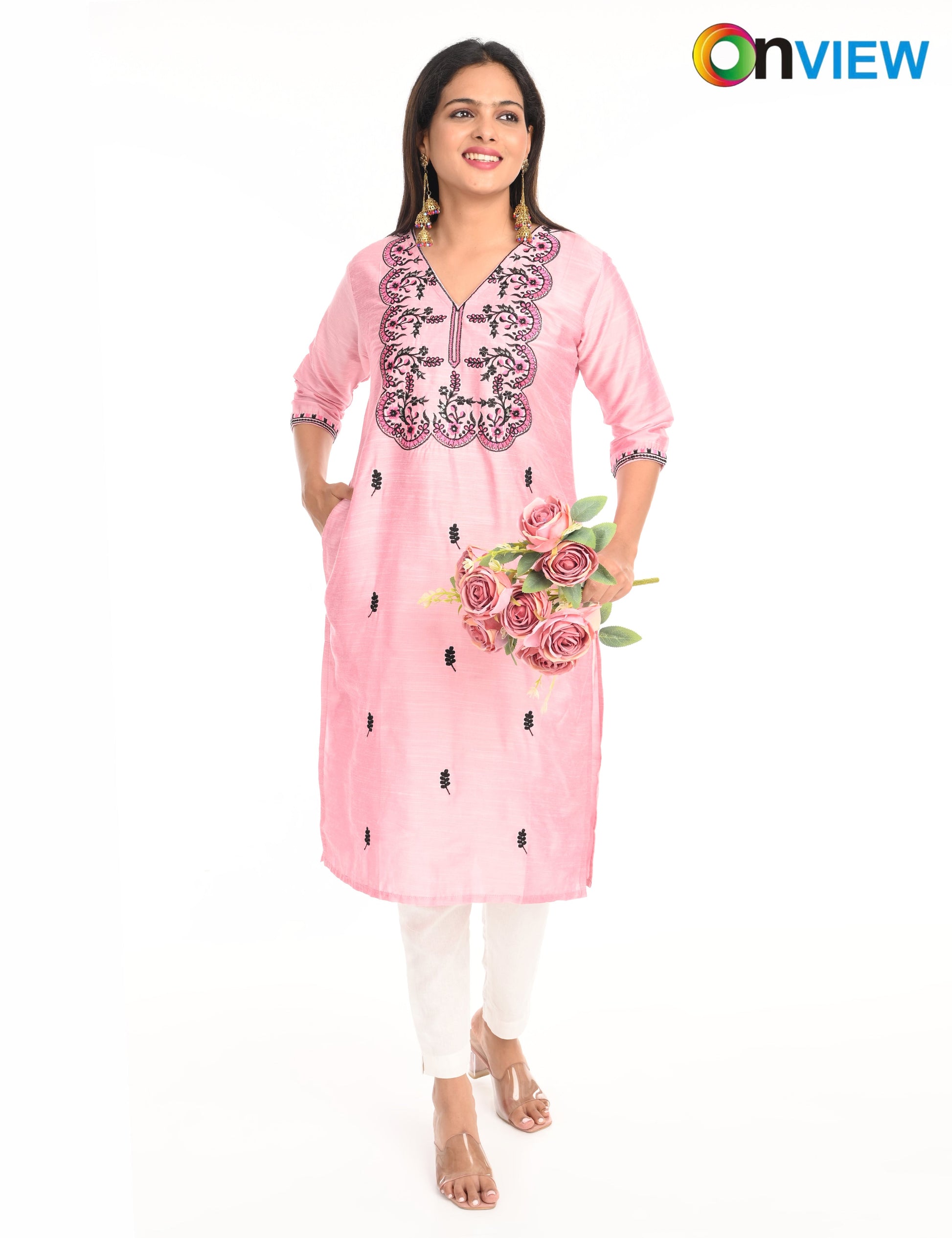 The kurti is adorned with subtle, intricate embroidery that adds a touch of grace and refinement. The small embroidery patterns are thoughtfully placed, creating a harmonious balance that enhances the overall design without overwhelming its simplicity. This design approach makes it versatile, suitable for festive gatherings, casual outings, or even formal office wear.