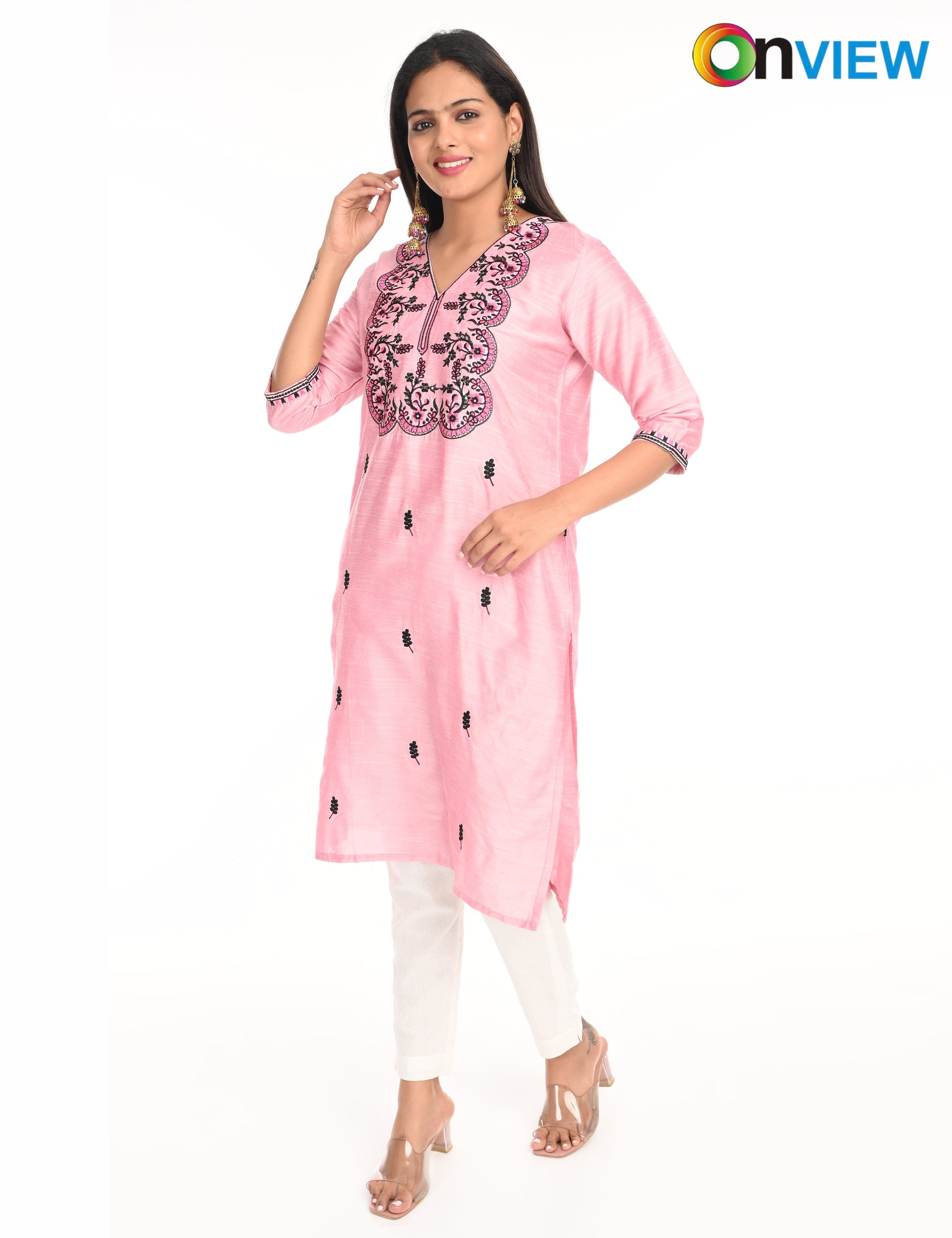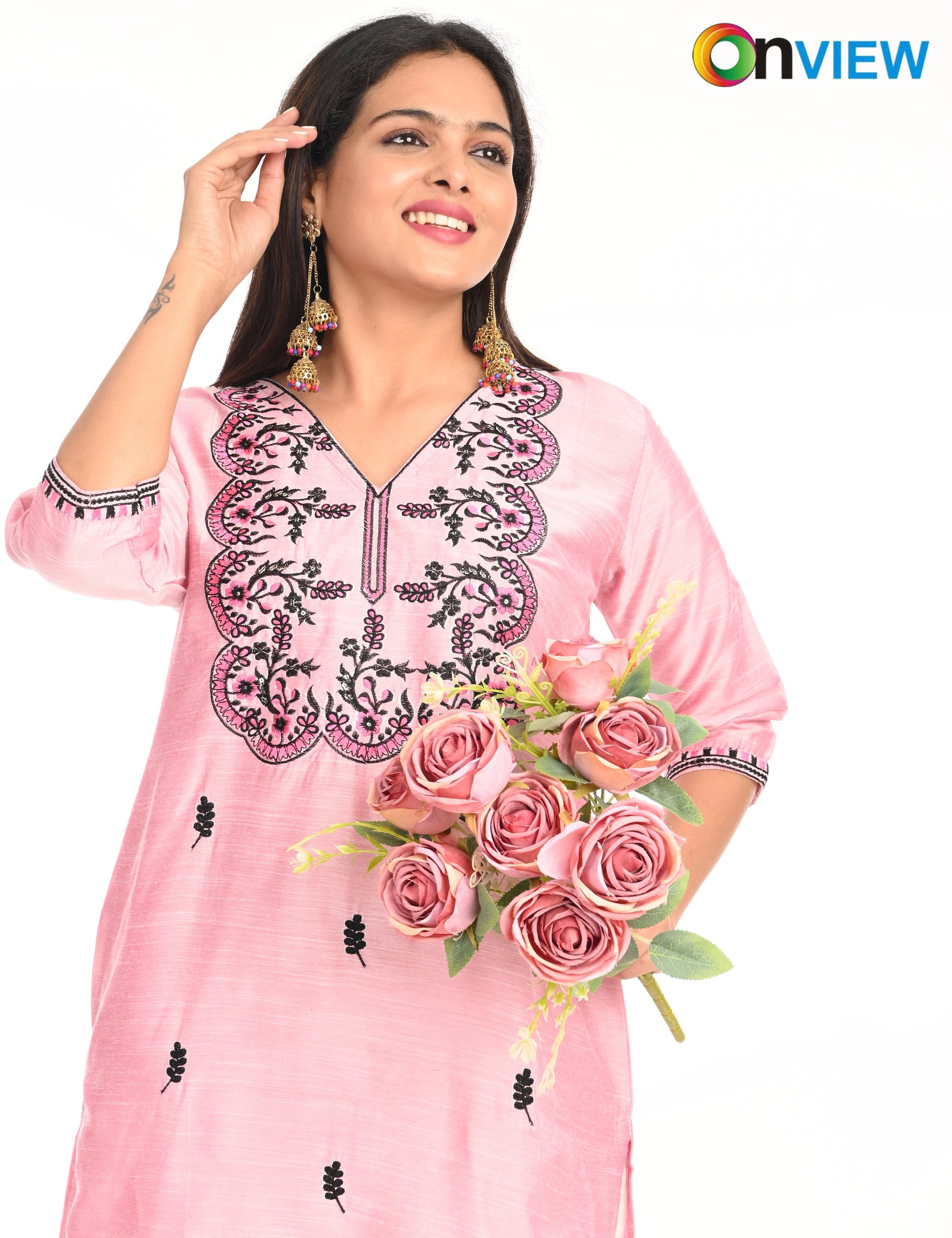 The ONVIEW SLUB BOUTIQUE WORK is a sophisticated blend of luxurious fabric and delicate craftsmanship, designed to elevate your style effortlessly. Made from premium-quality silk, this kurti boasts a rich texture and an elegant sheen that exudes opulence, making it a perfect choice for special occasions or everyday elegance.