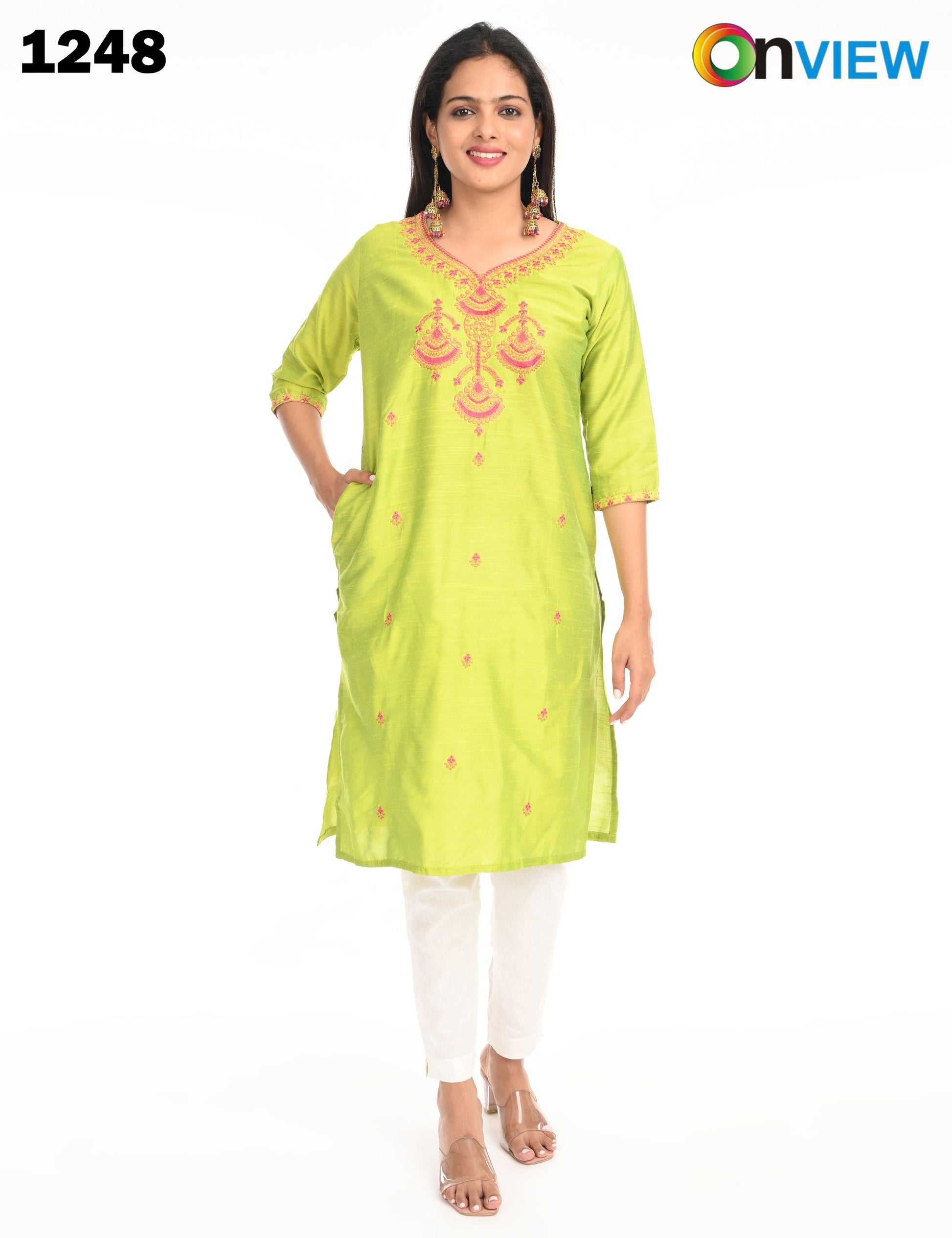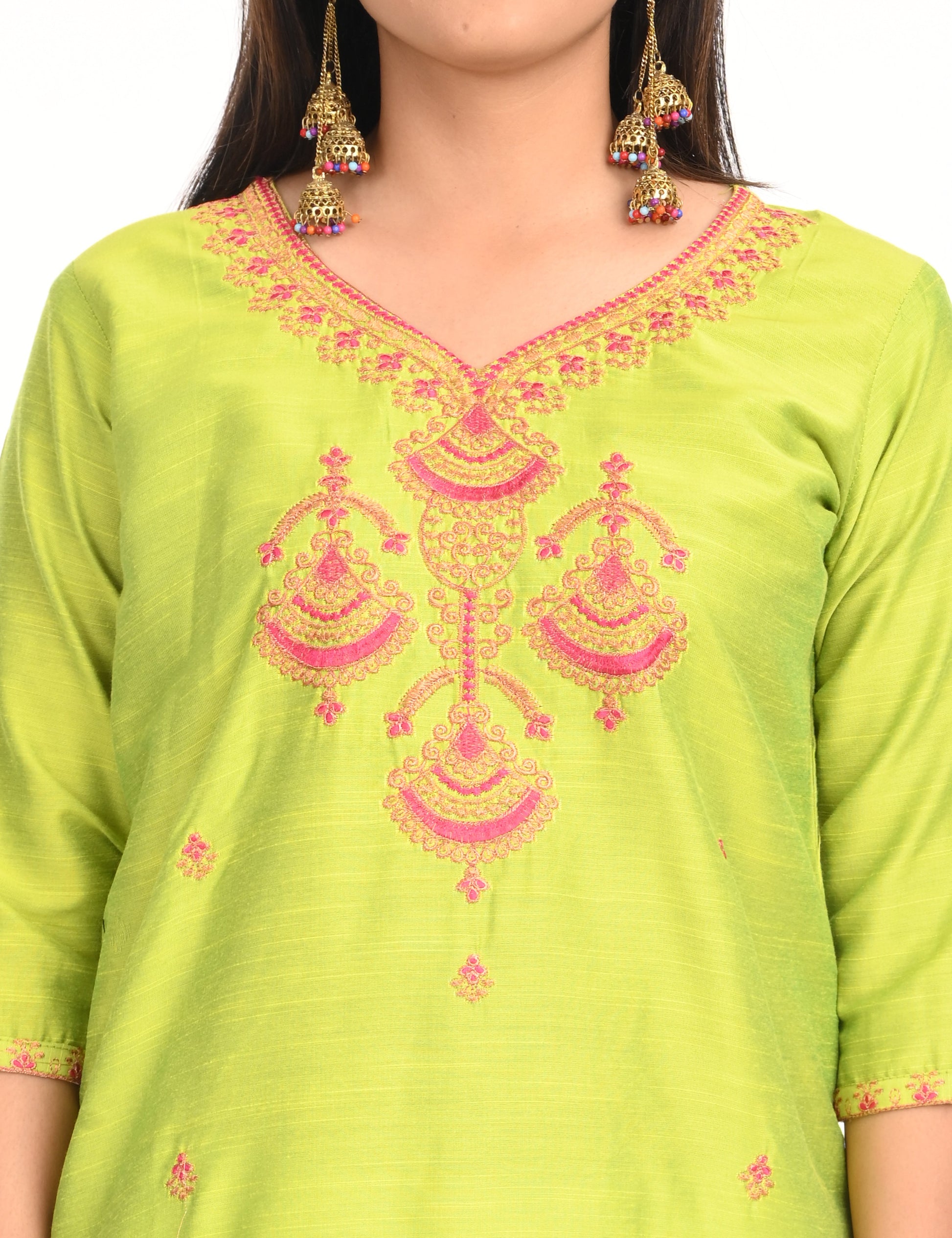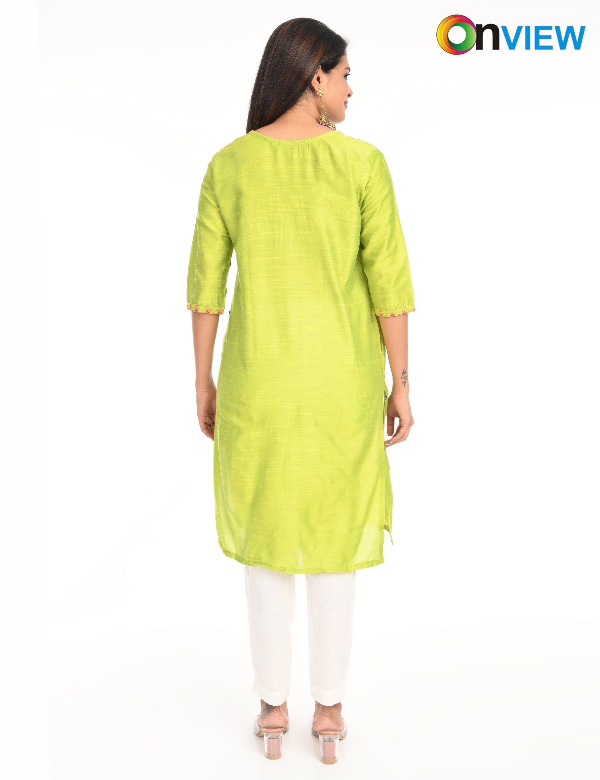 The kurti is adorned with subtle, intricate embroidery that adds a touch of grace and refinement. The small embroidery patterns are thoughtfully placed, creating a harmonious balance that enhances the overall design without overwhelming its simplicity. This design approach makes it versatile, suitable for festive gatherings, casual outings, or even formal office wear.