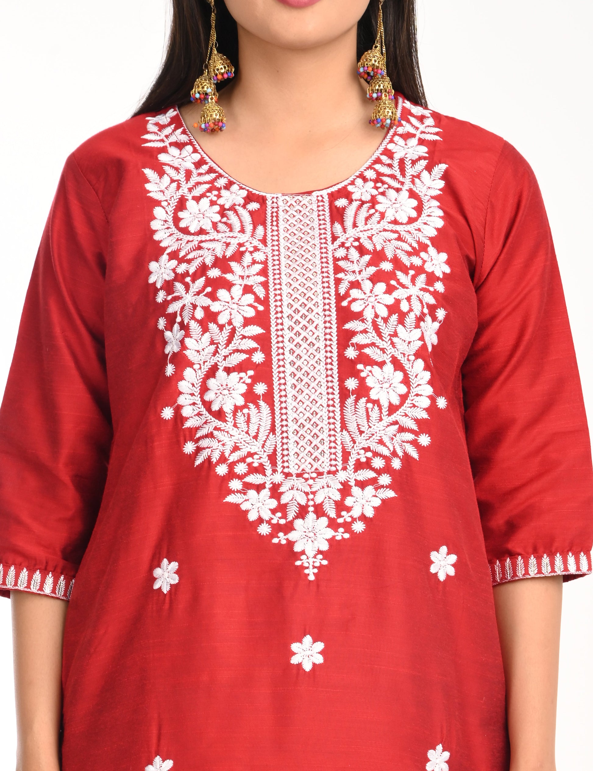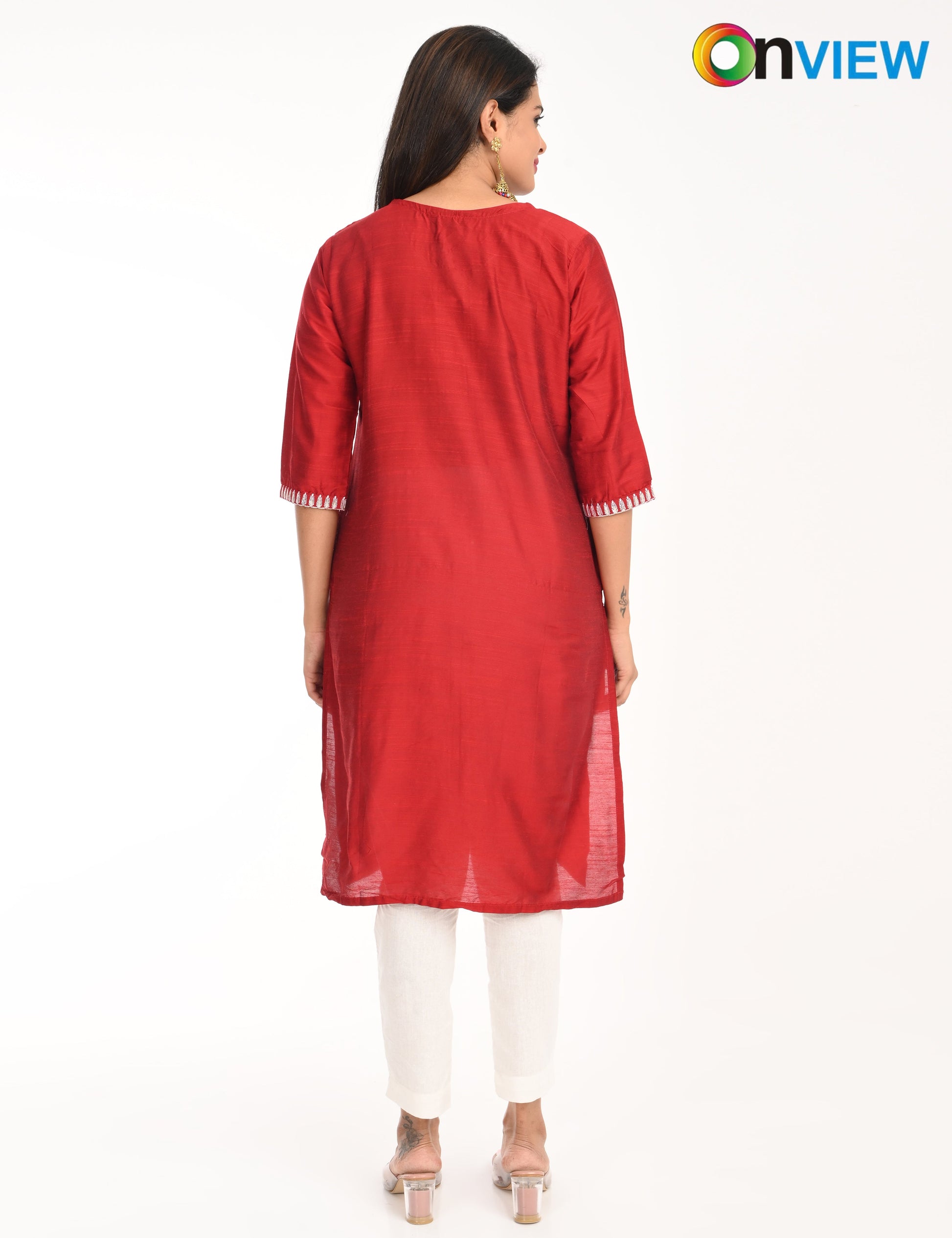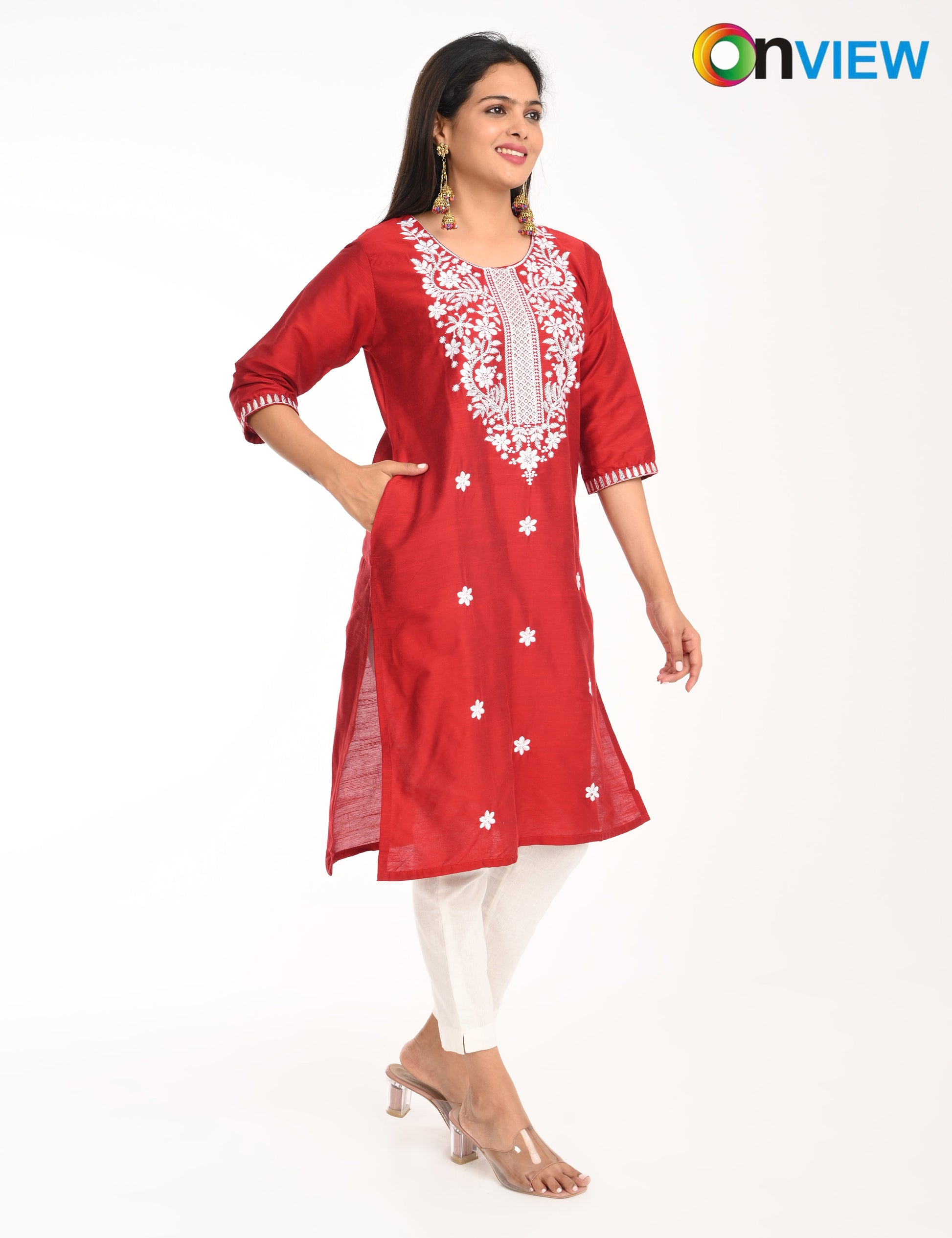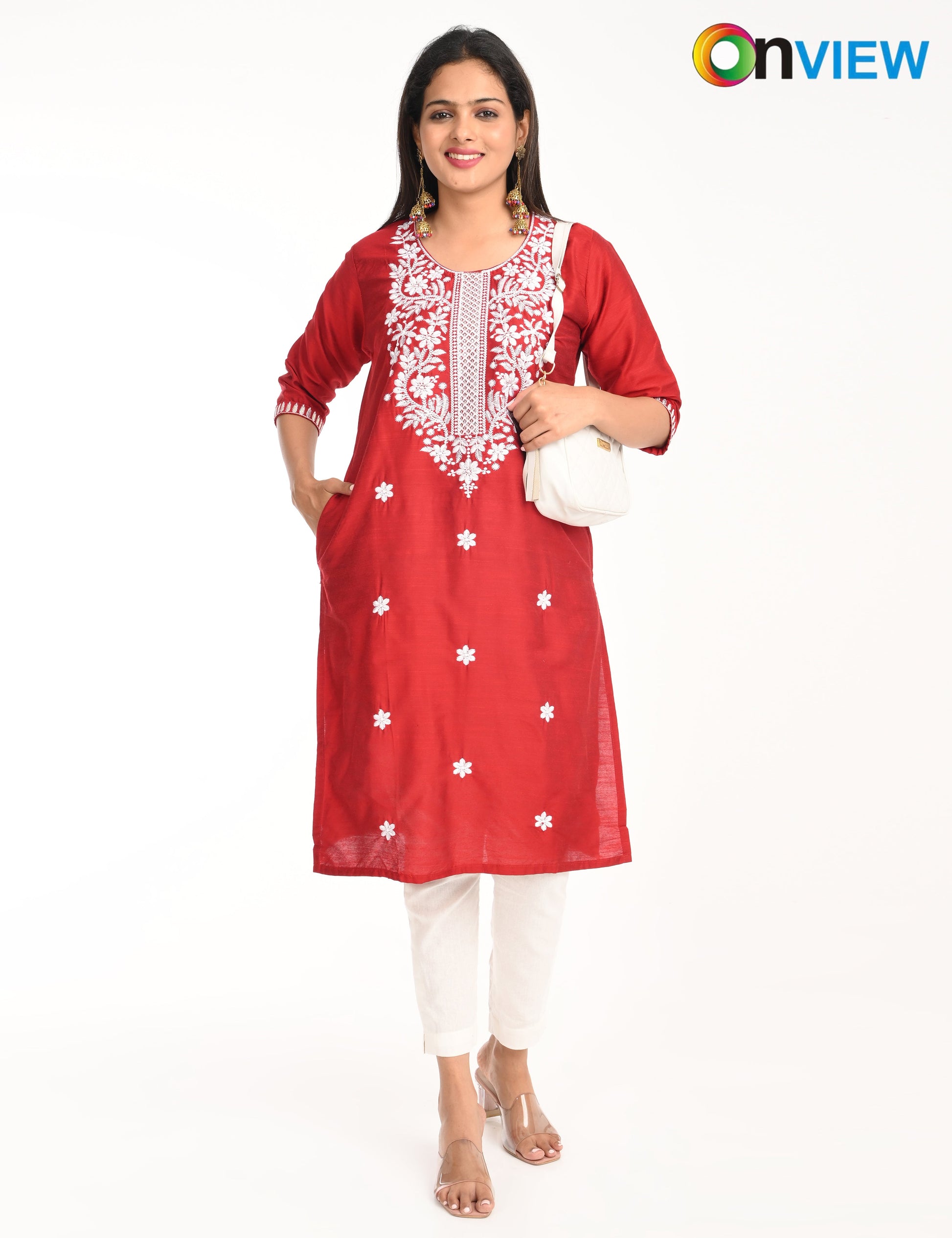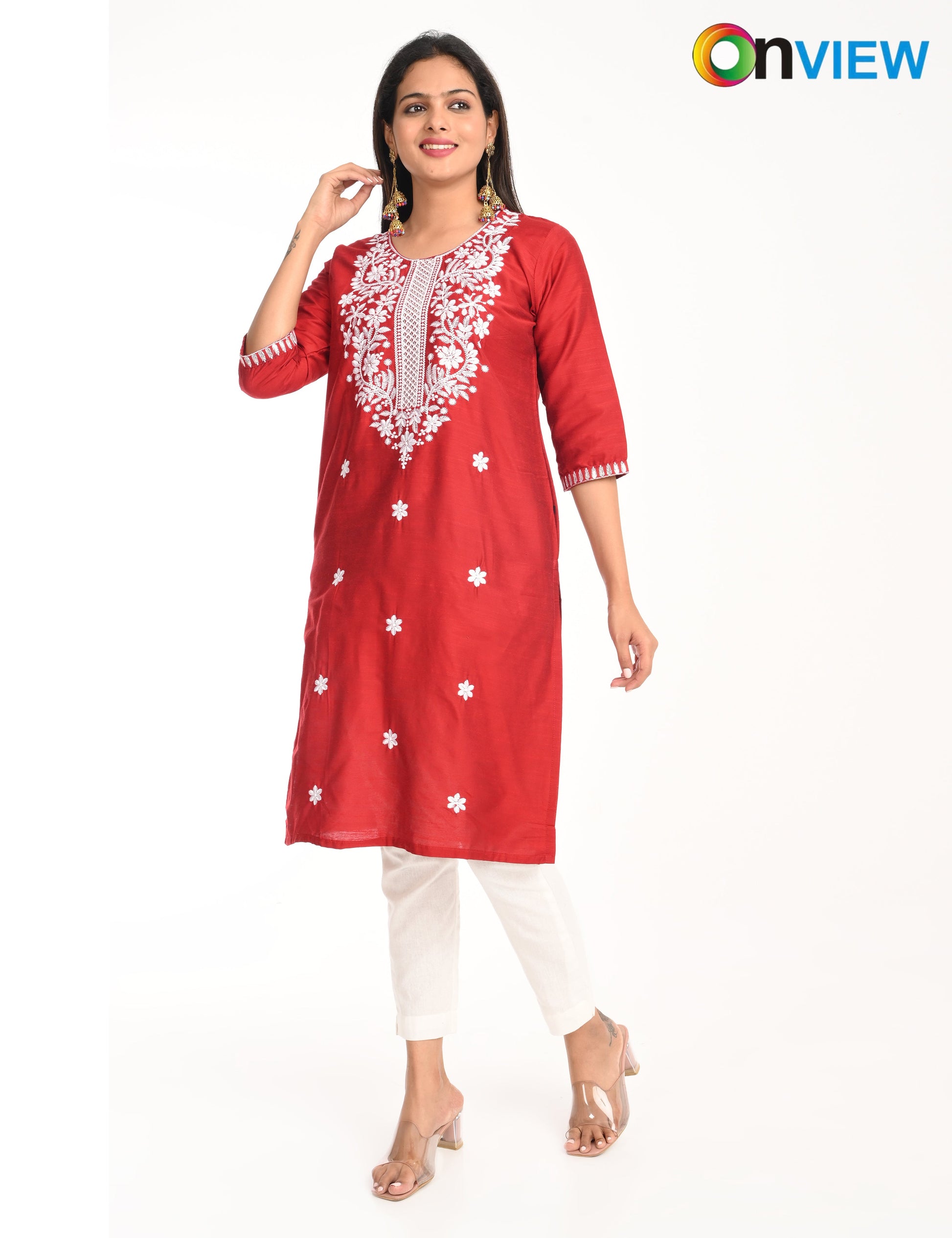 The kurti is adorned with subtle, intricate embroidery that adds a touch of grace and refinement. The small embroidery patterns are thoughtfully placed, creating a harmonious balance that enhances the overall design without overwhelming its simplicity. This design approach makes it versatile, suitable for festive gatherings, casual outings, or even formal office wear.