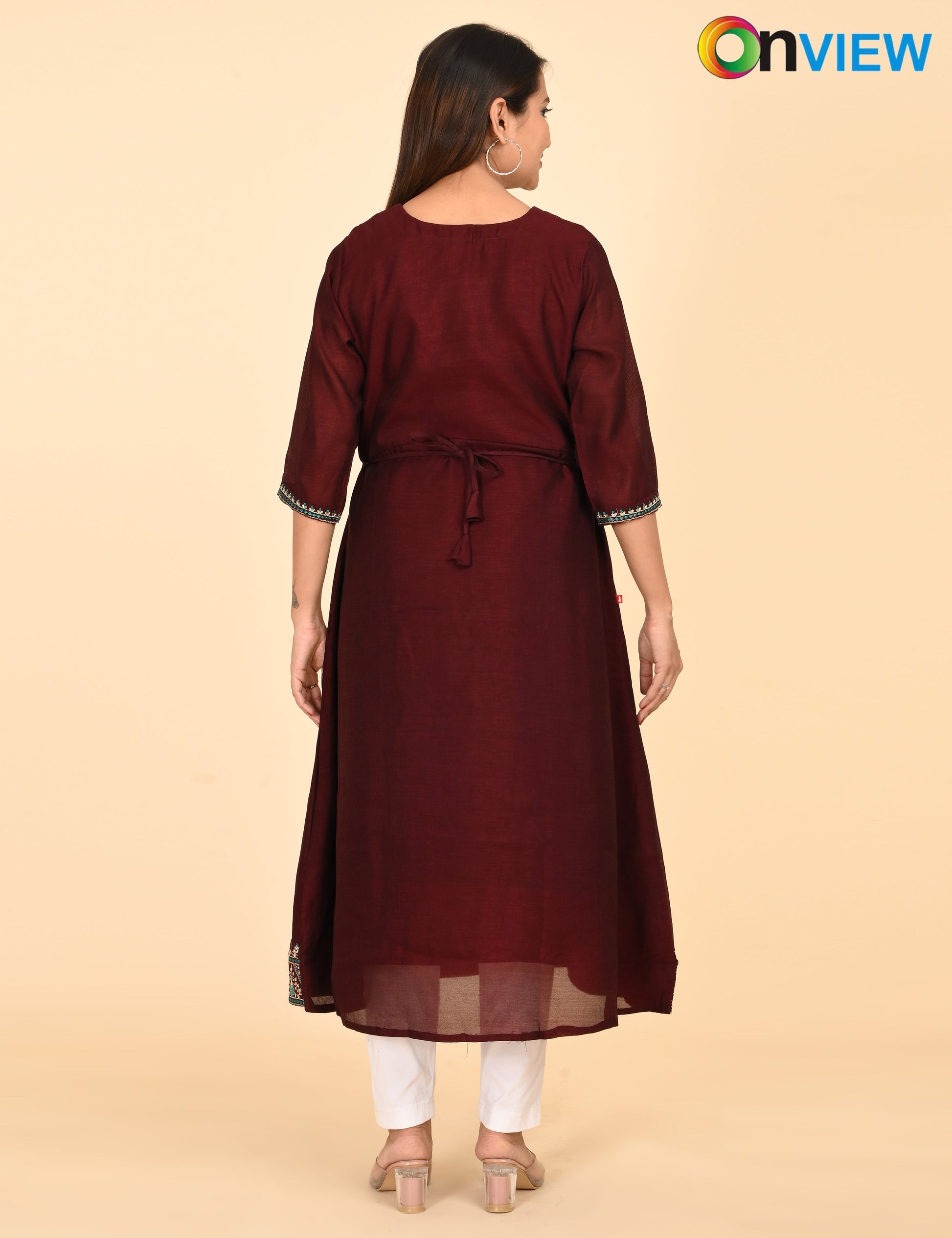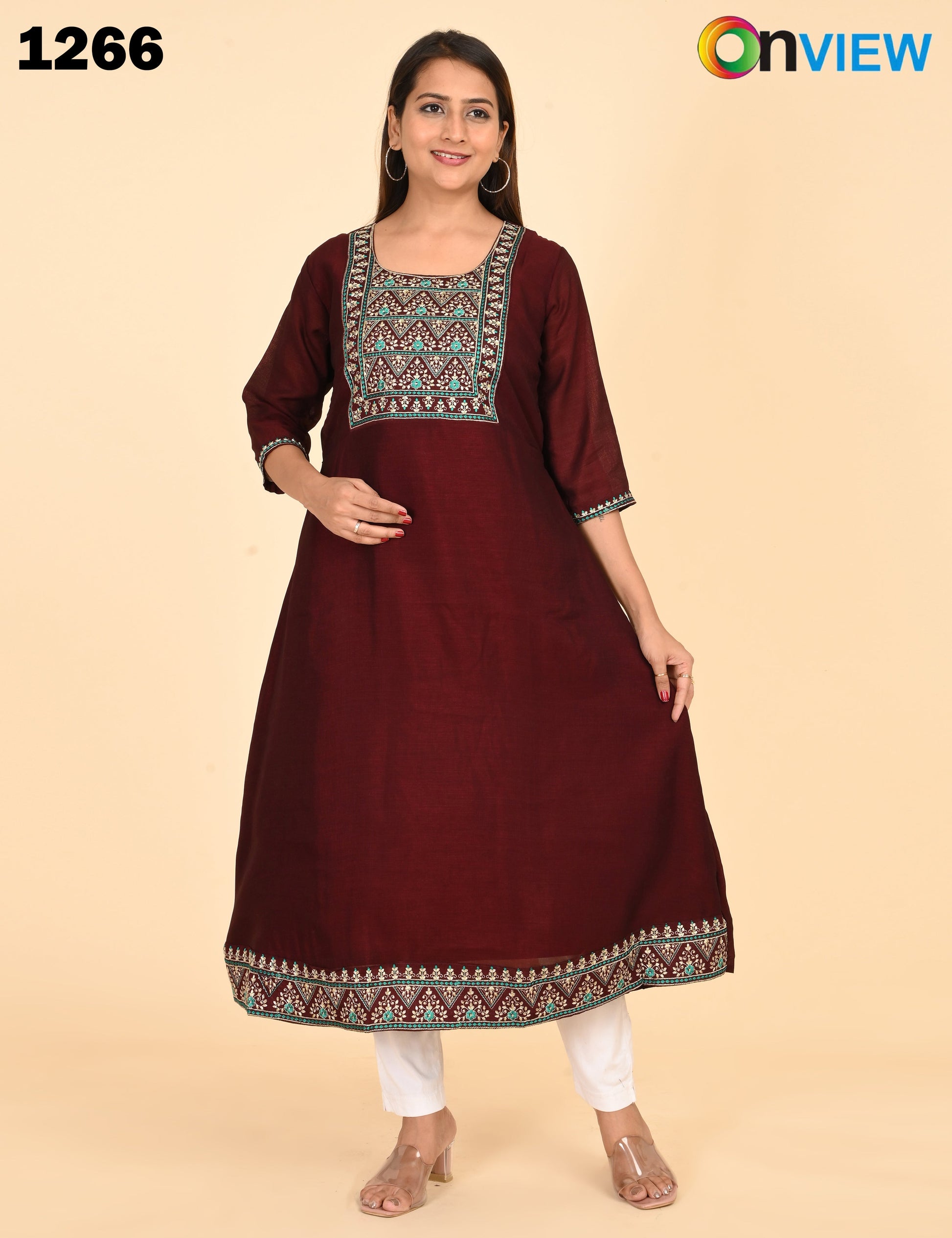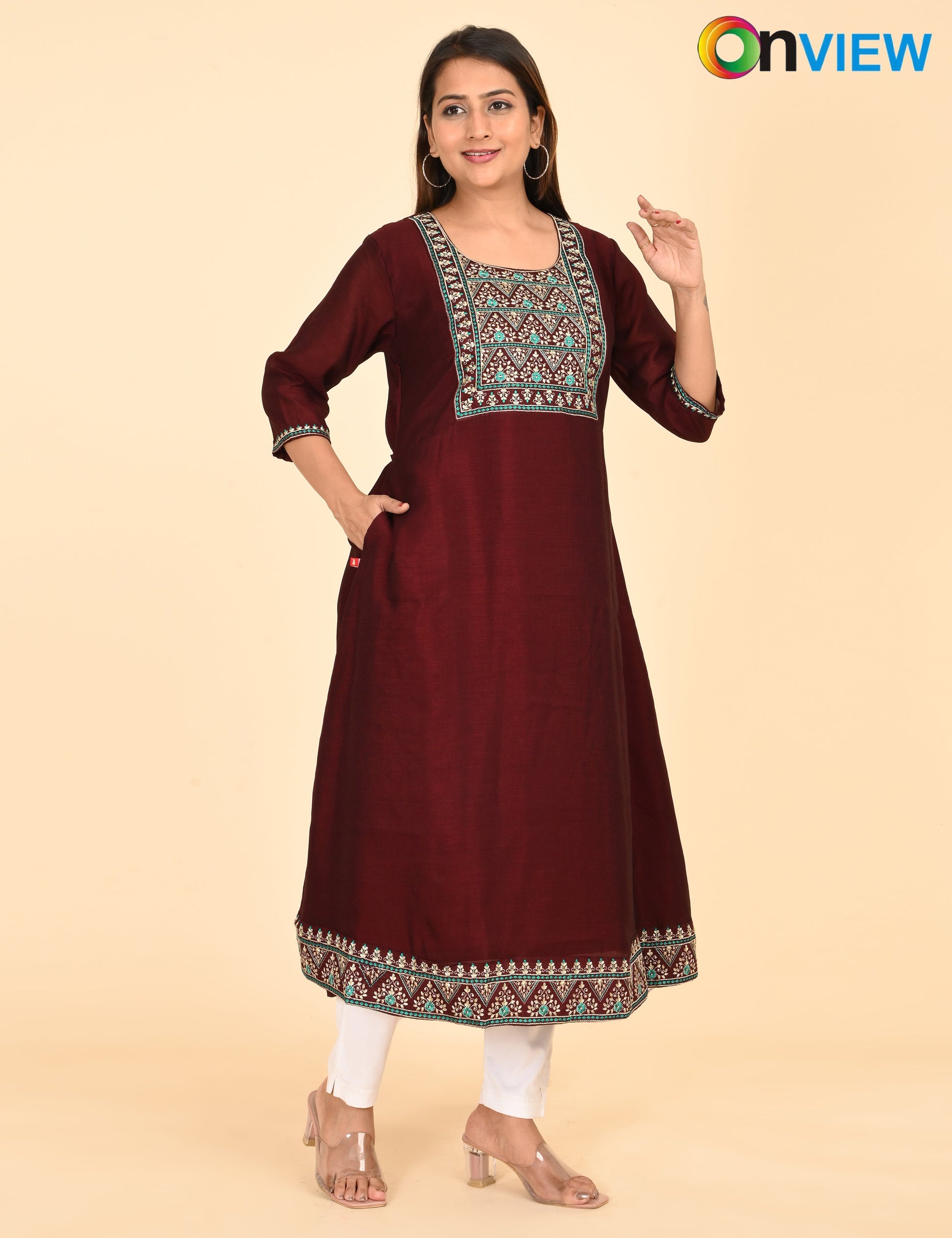 The ONVIEW | SHIMMER BOUTIQUE WORK WITH UMBRELLA is a sophisticated blend of luxurious fabric and delicate craftsmanship, designed to elevate your style effortlessly. Made from premium-quality silk, this kurti boasts a rich texture and an elegant sheen that exudes opulence, making it a perfect choice for special occasions or everyday elegance.