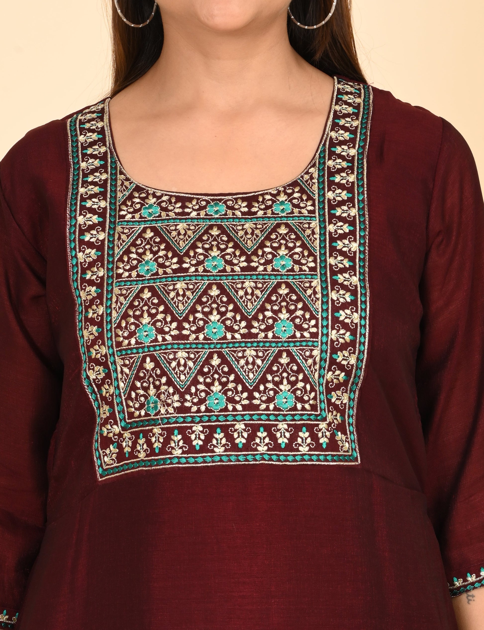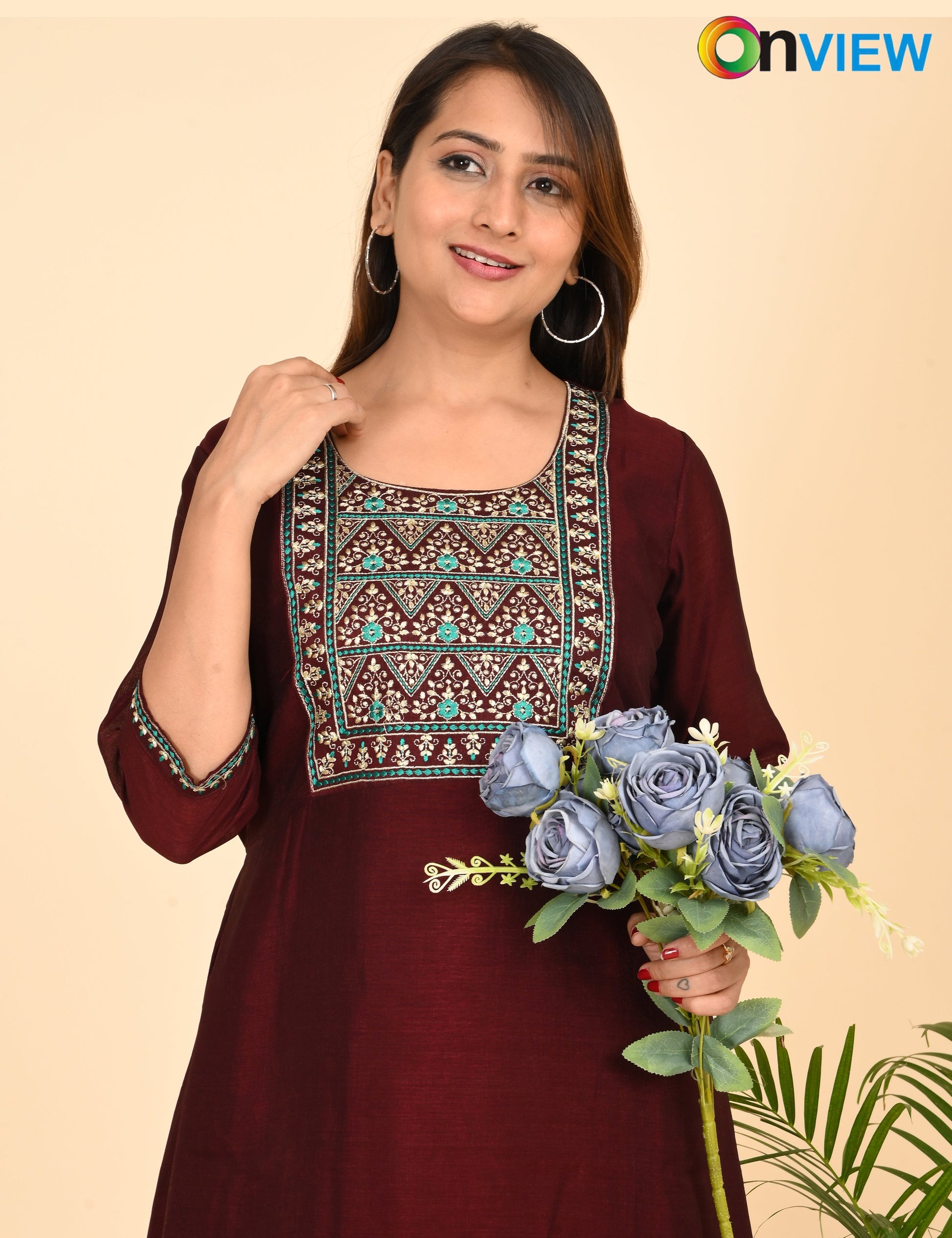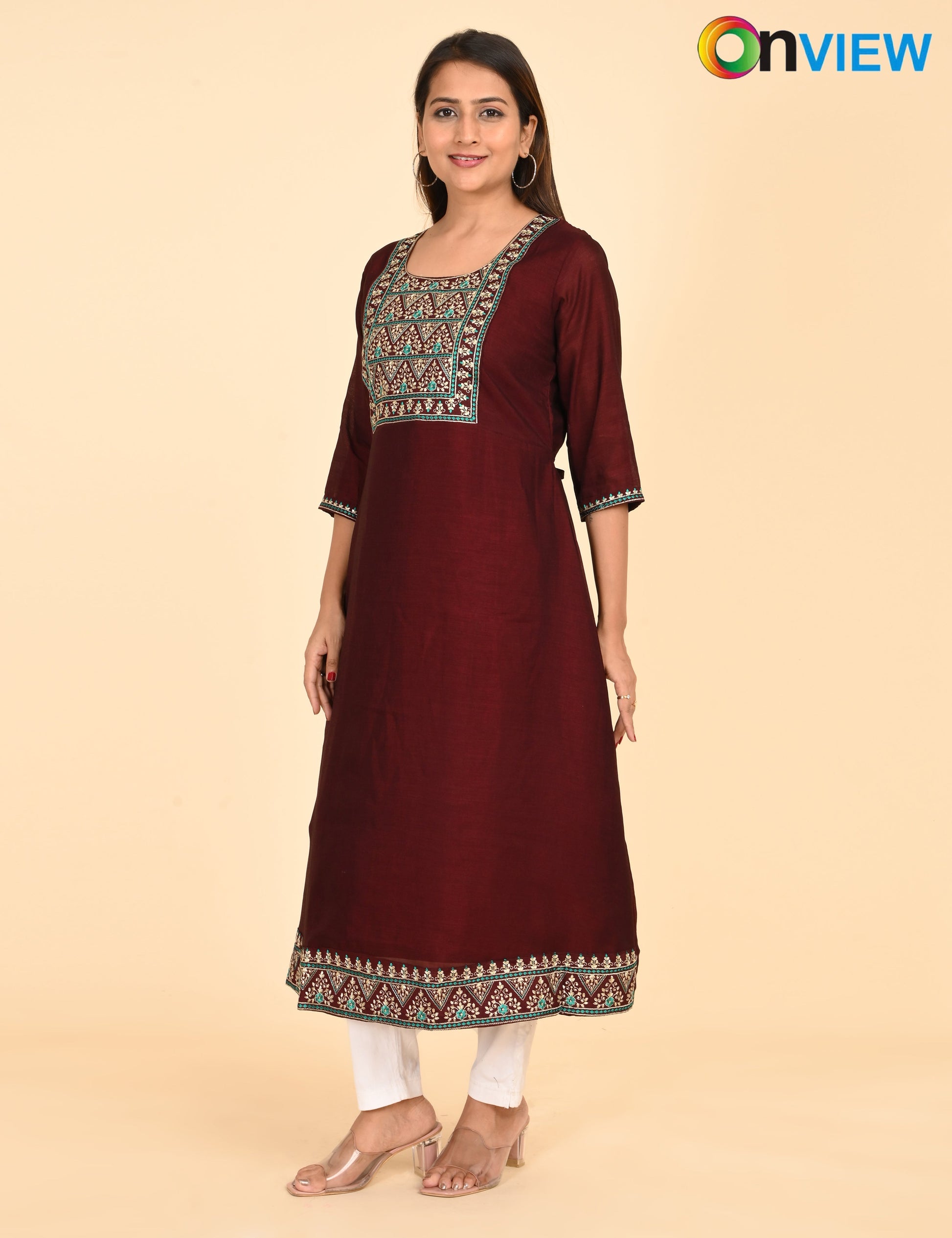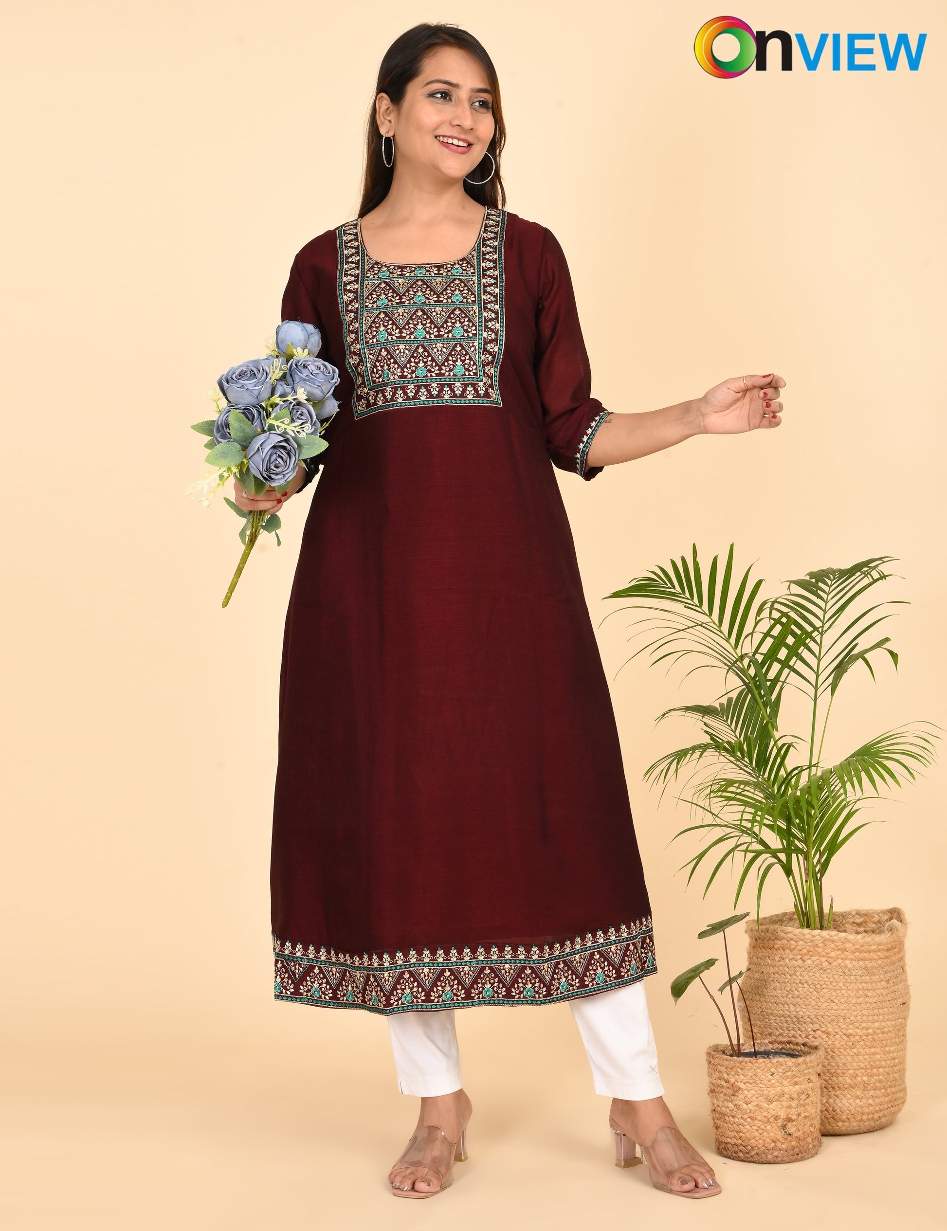 The kurti is adorned with subtle, intricate embroidery that adds a touch of grace and refinement. The small embroidery patterns are thoughtfully placed, creating a harmonious balance that enhances the overall design without overwhelming its simplicity. This design approach makes it versatile, suitable for festive gatherings, casual outings, or even formal office wear.
