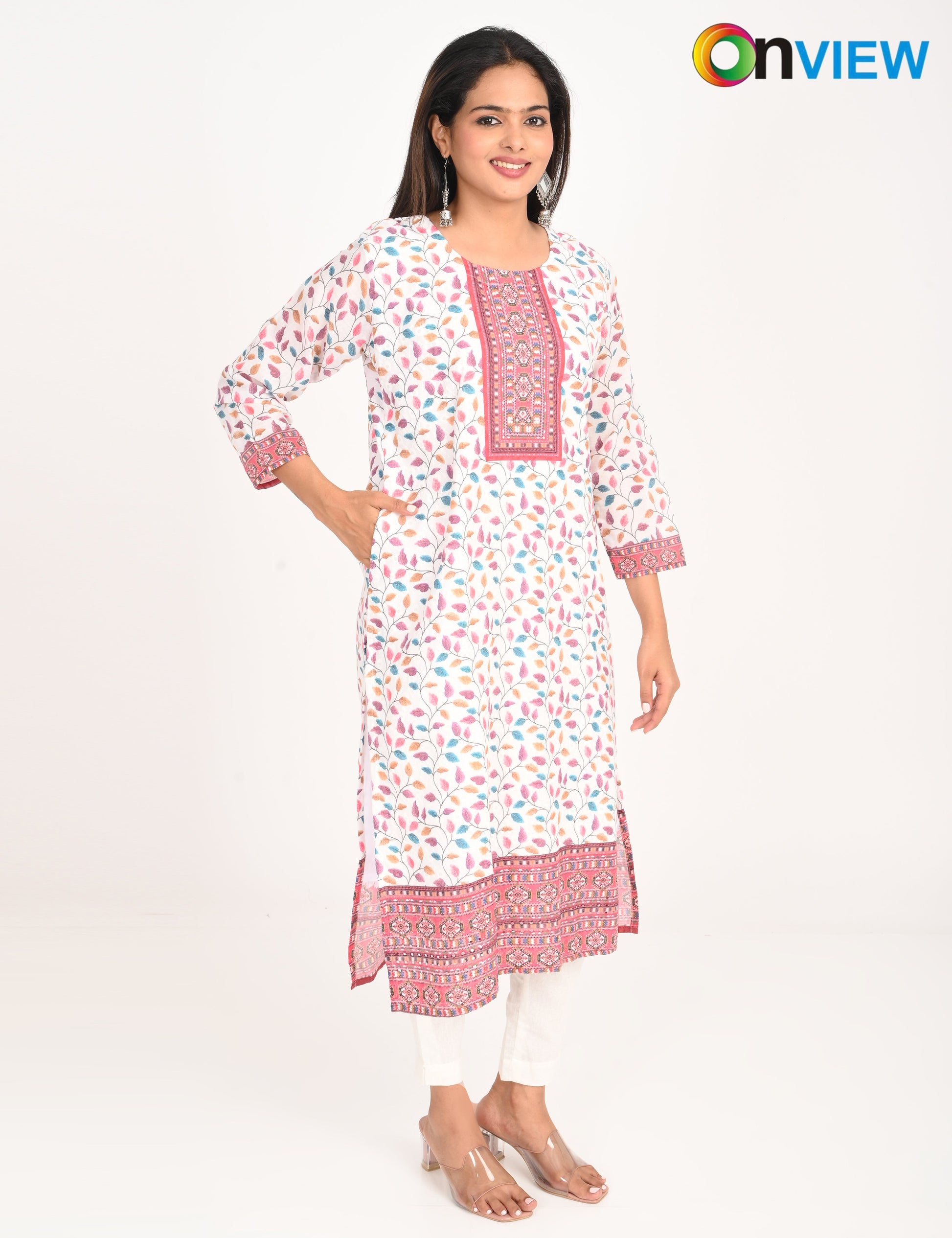 The ONVIEW COTTON CHIKANKARI WORK WITH DIGITAL PRINT is a sophisticated blend of luxurious fabric and delicate craftsmanship, designed to elevate your style effortlessly. Made from premium-quality silk, this kurti boasts a rich texture and an elegant sheen that exudes opulence, making it a perfect choice for special occasions or everyday elegance.
