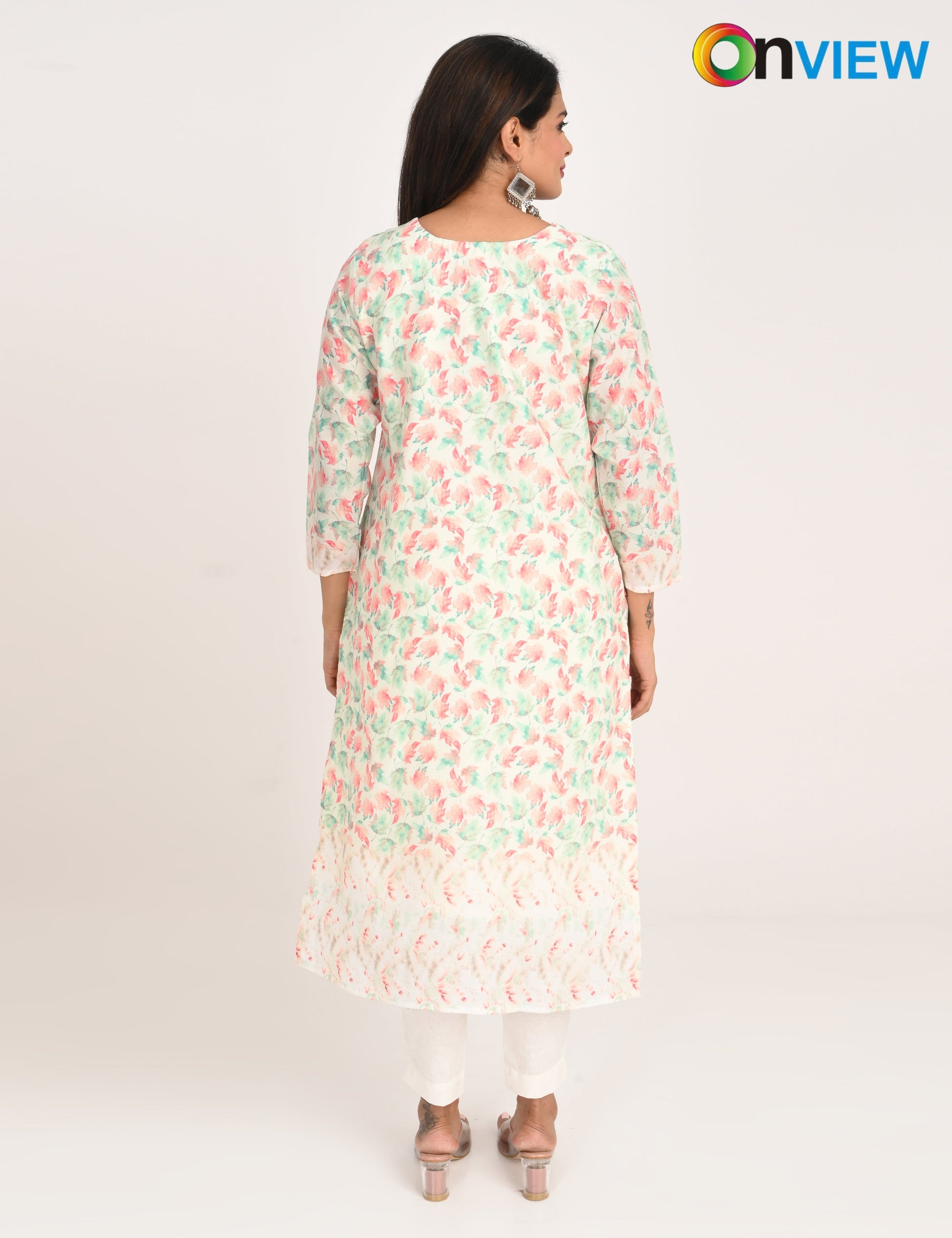 The ONVIEW COTTON CHIKANKARI WORK WITH DIGITAL PRINT is a sophisticated blend of luxurious fabric and delicate craftsmanship, designed to elevate your style effortlessly. Made from premium-quality silk, this kurti boasts a rich texture and an elegant sheen that exudes opulence, making it a perfect choice for special occasions or everyday elegance.