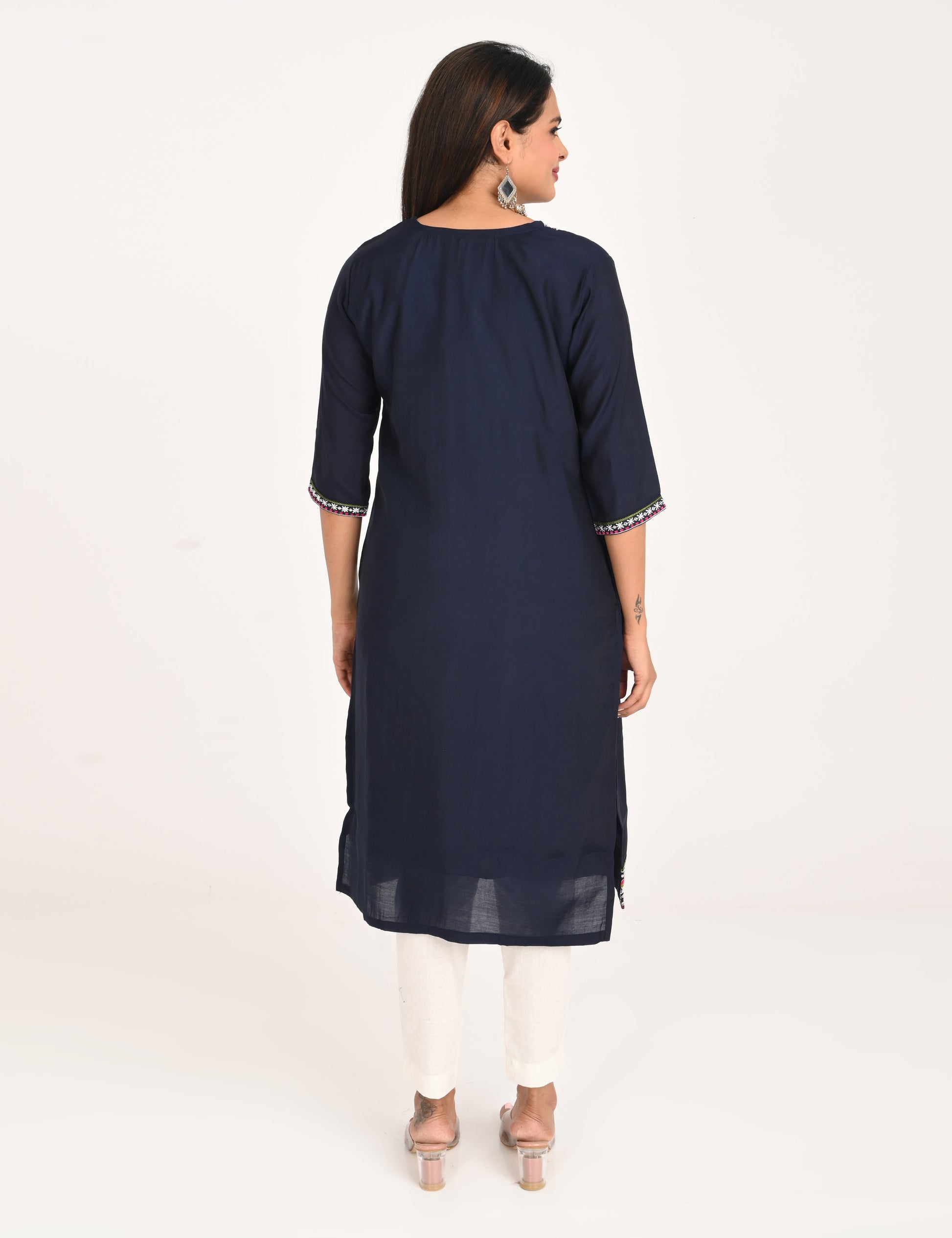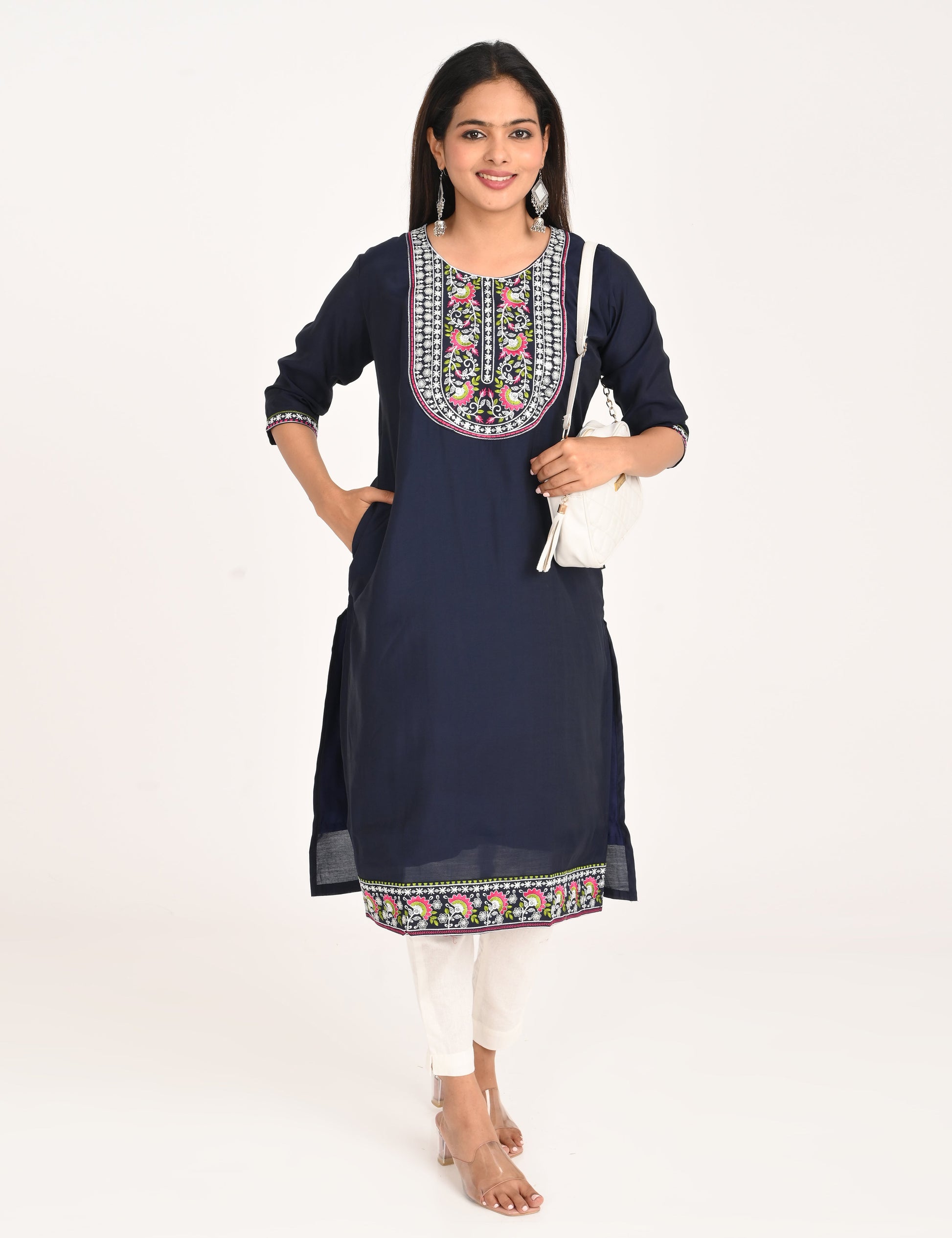 The kurti is adorned with subtle, intricate embroidery that adds a touch of grace and refinement. The small embroidery patterns are thoughtfully placed, creating a harmonious balance that enhances the overall design without overwhelming its simplicity. This design approach makes it versatile, suitable for festive gatherings, casual outings, or even formal office wear.