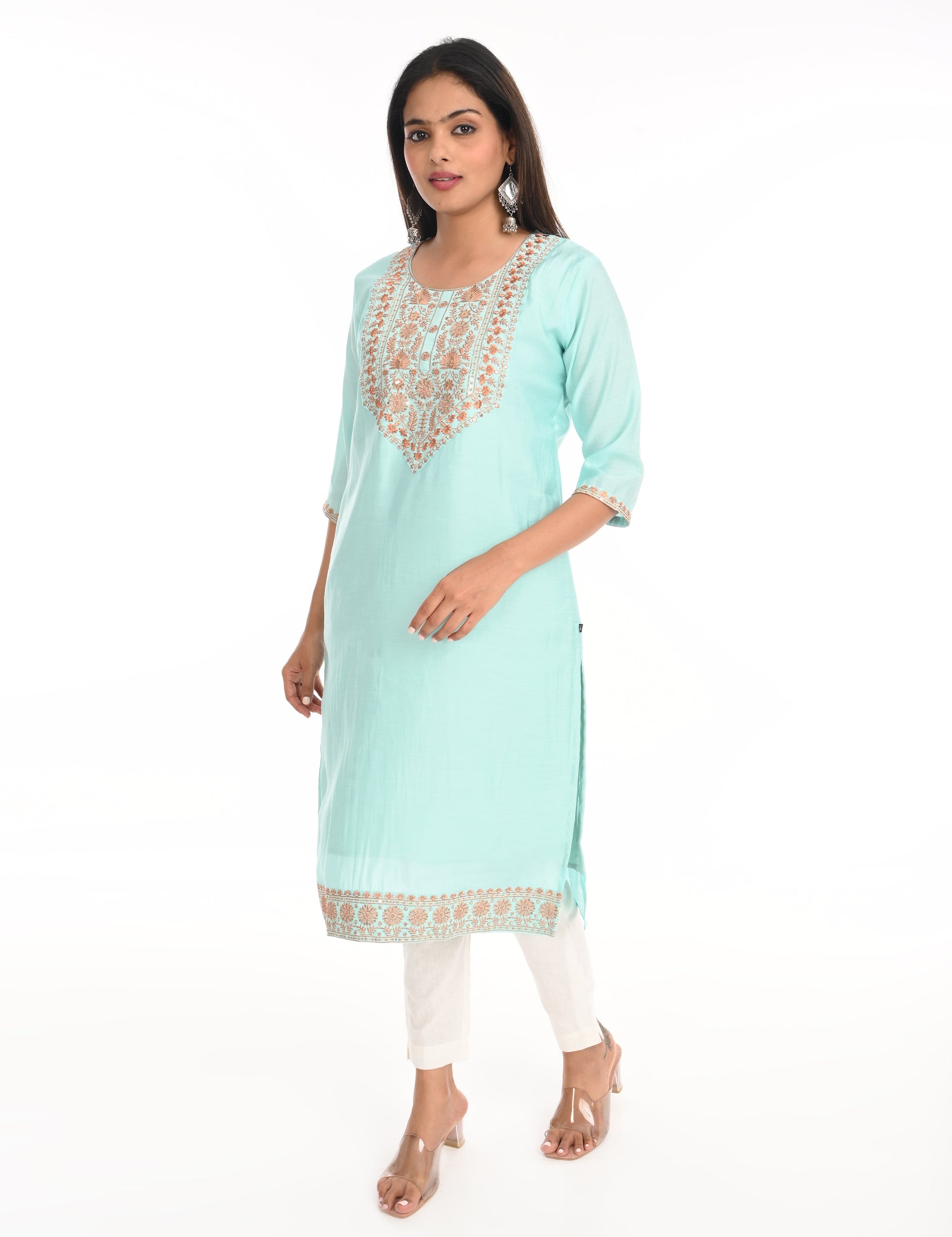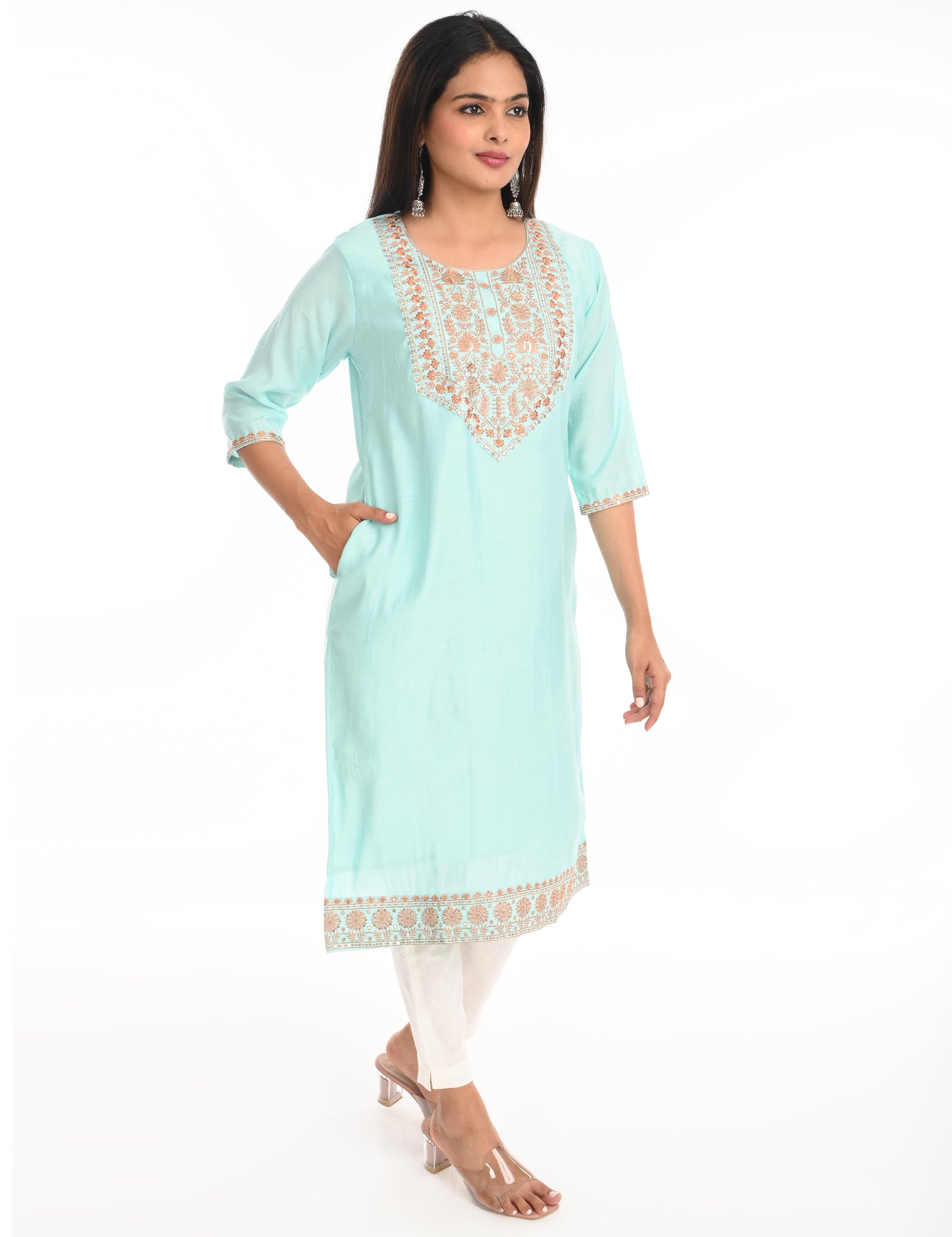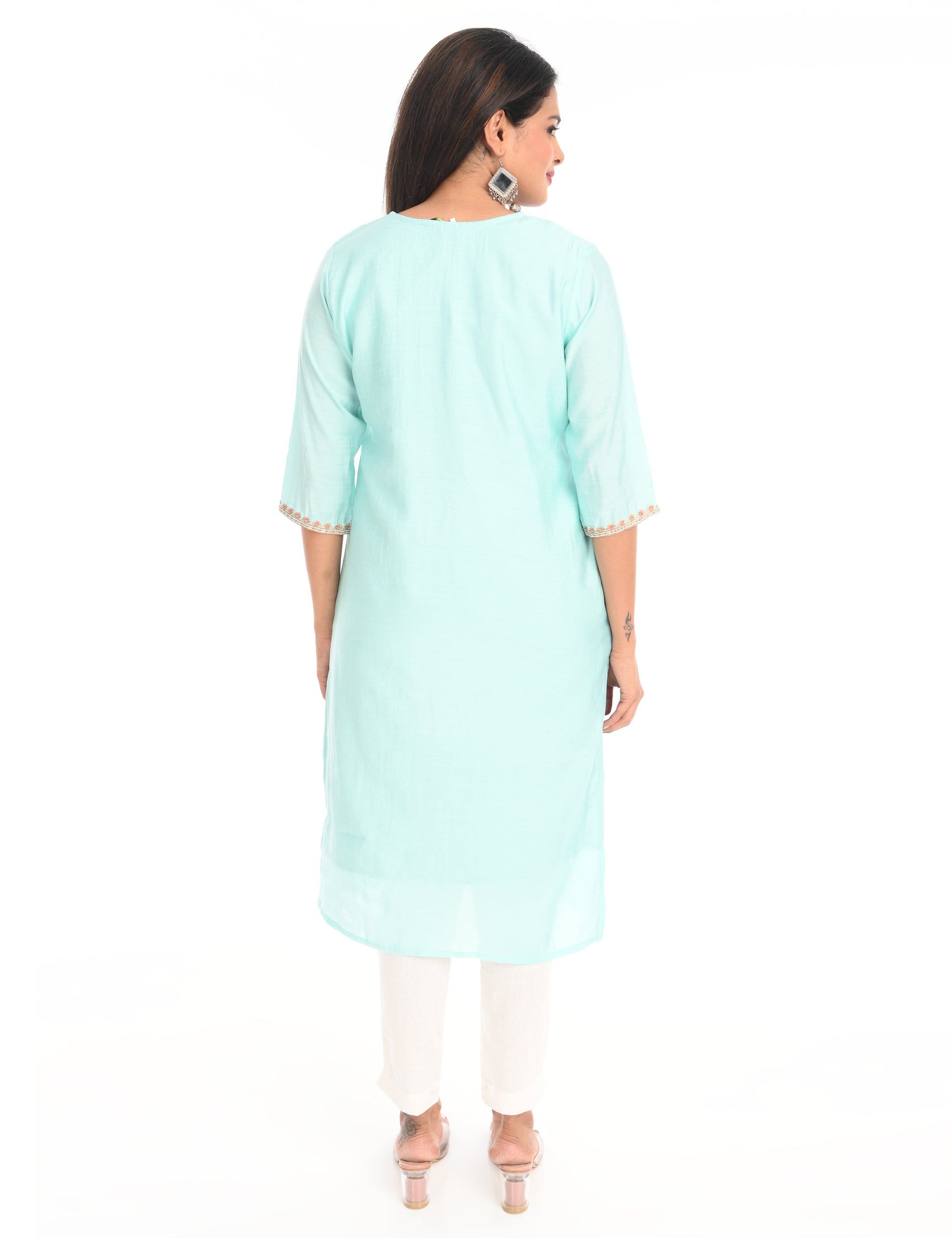 The kurti is adorned with subtle, intricate embroidery that adds a touch of grace and refinement. The small embroidery patterns are thoughtfully placed, creating a harmonious balance that enhances the overall design without overwhelming its simplicity. This design approach makes it versatile, suitable for festive gatherings, casual outings, or even formal office wear.