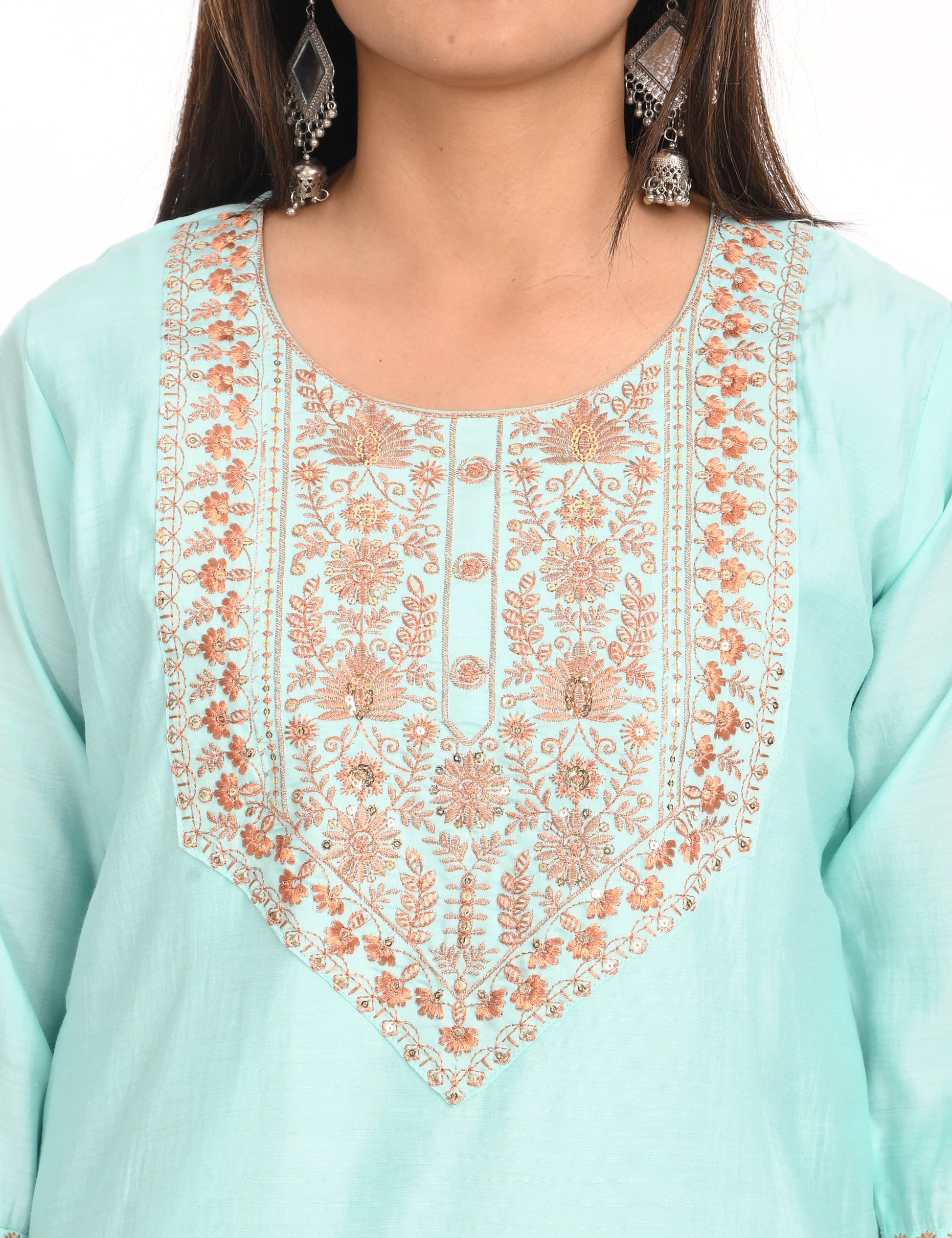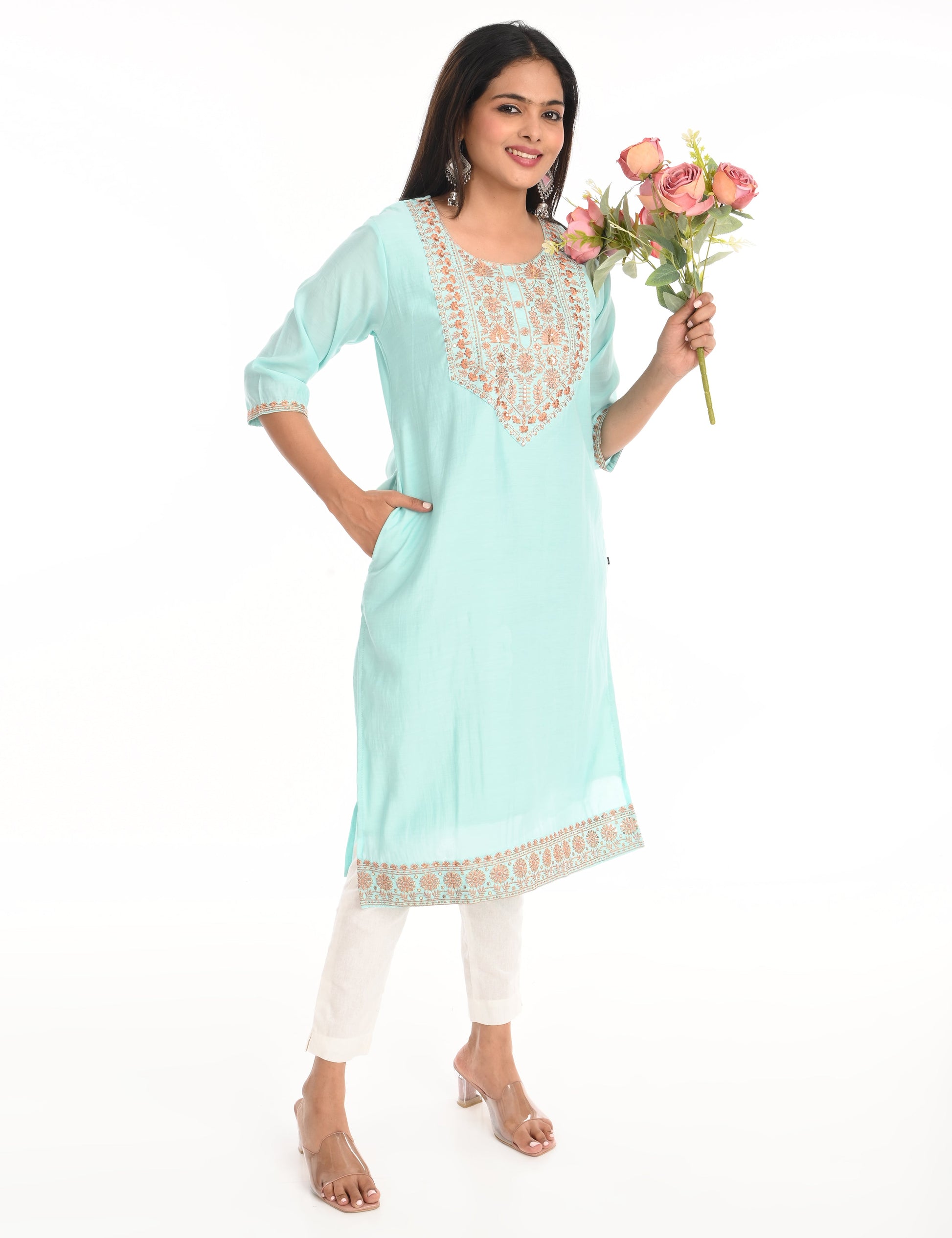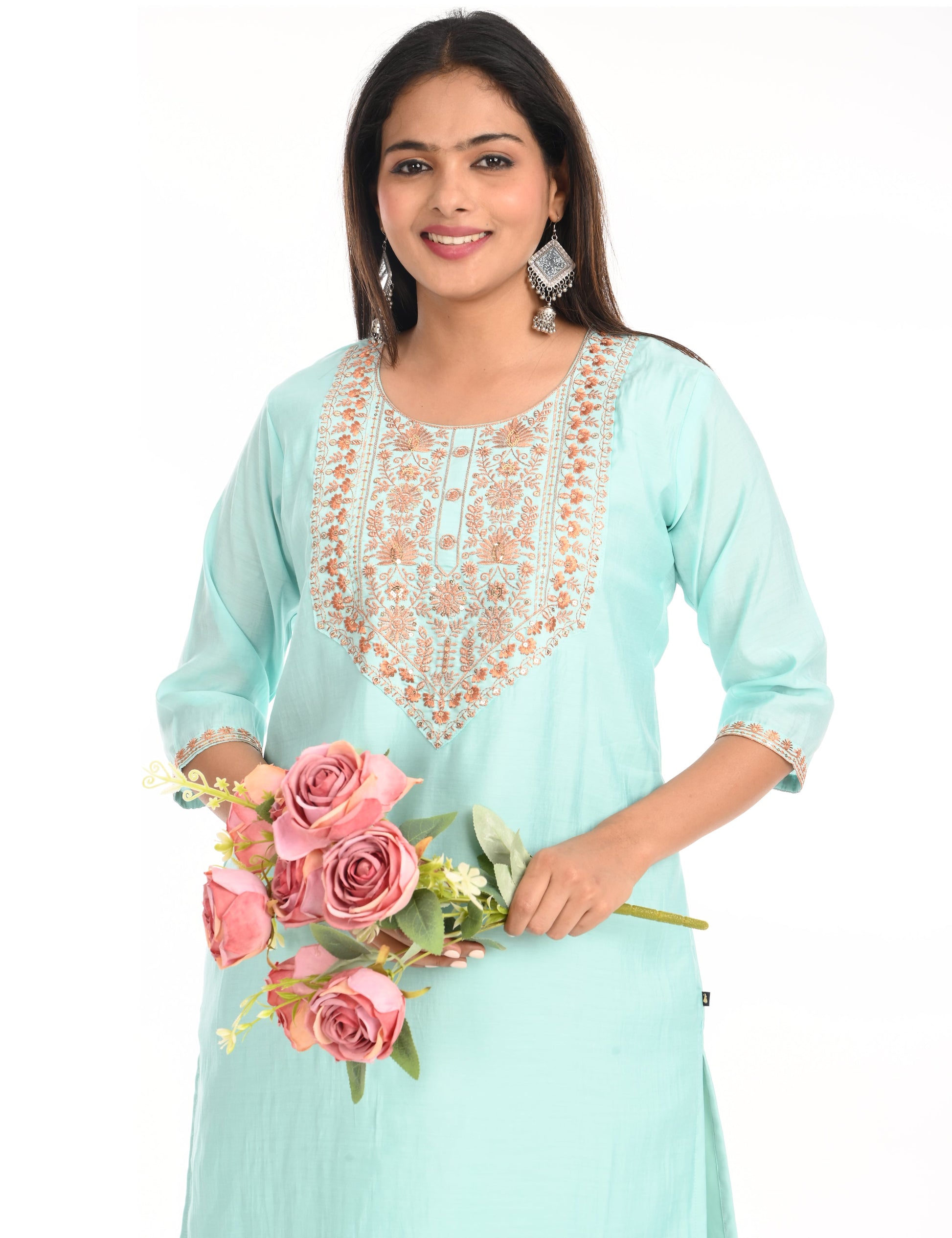 The kurti is adorned with subtle, intricate embroidery that adds a touch of grace and refinement. The small embroidery patterns are thoughtfully placed, creating a harmonious balance that enhances the overall design without overwhelming its simplicity. This design approach makes it versatile, suitable for festive gatherings, casual outings, or even formal office wear.
