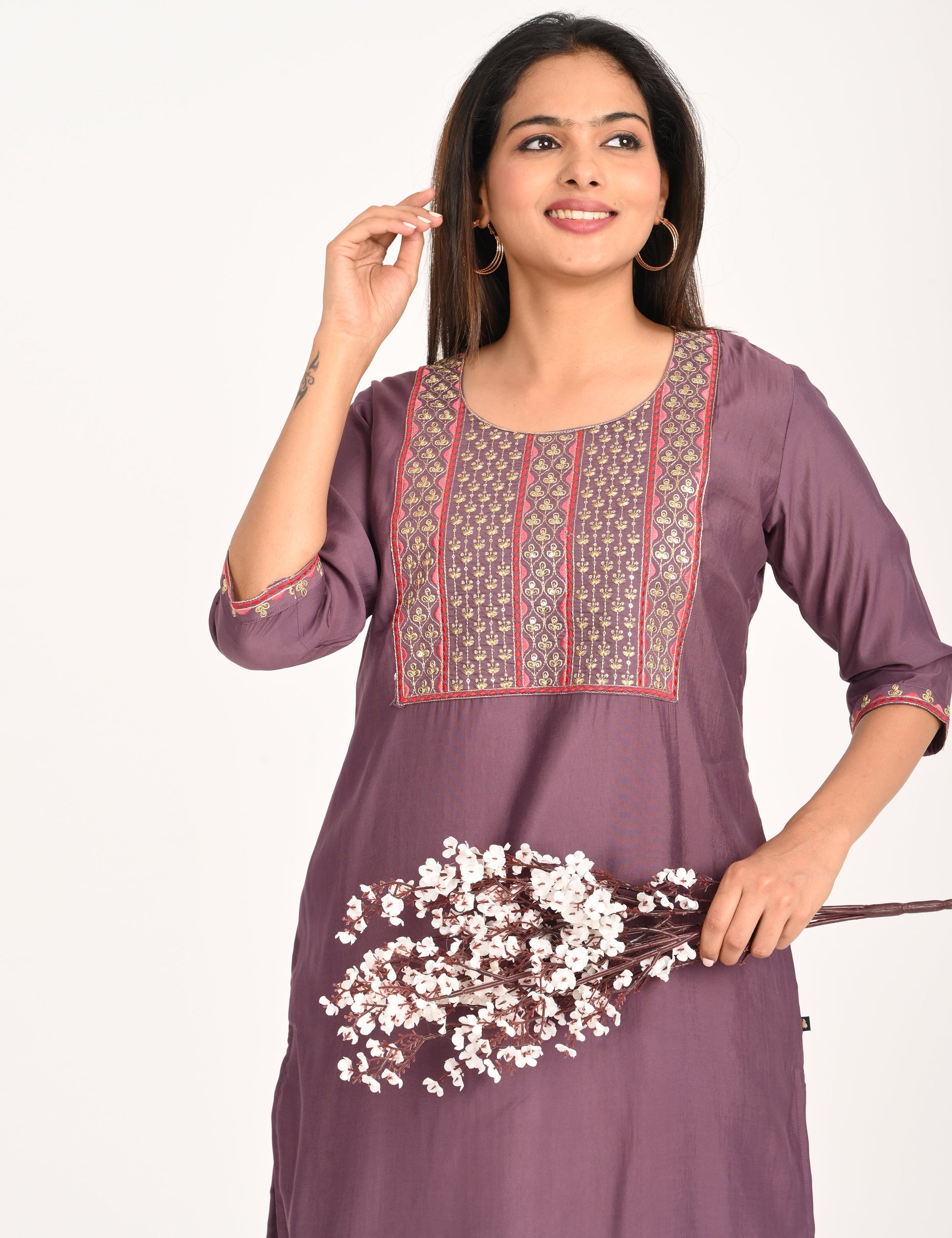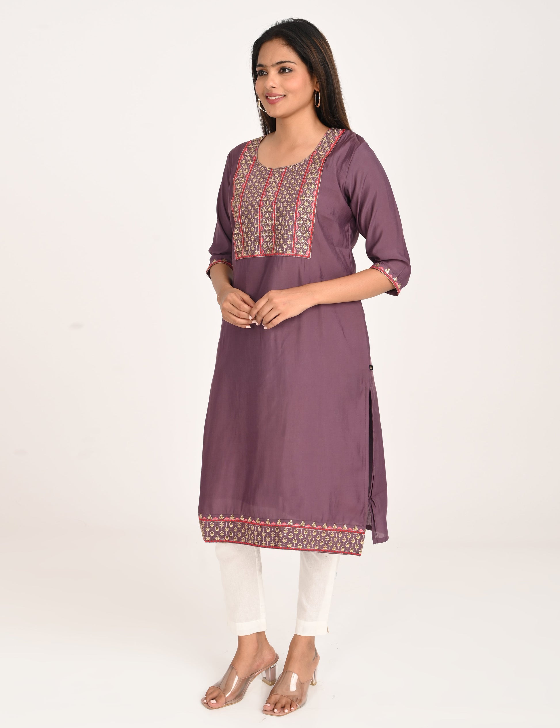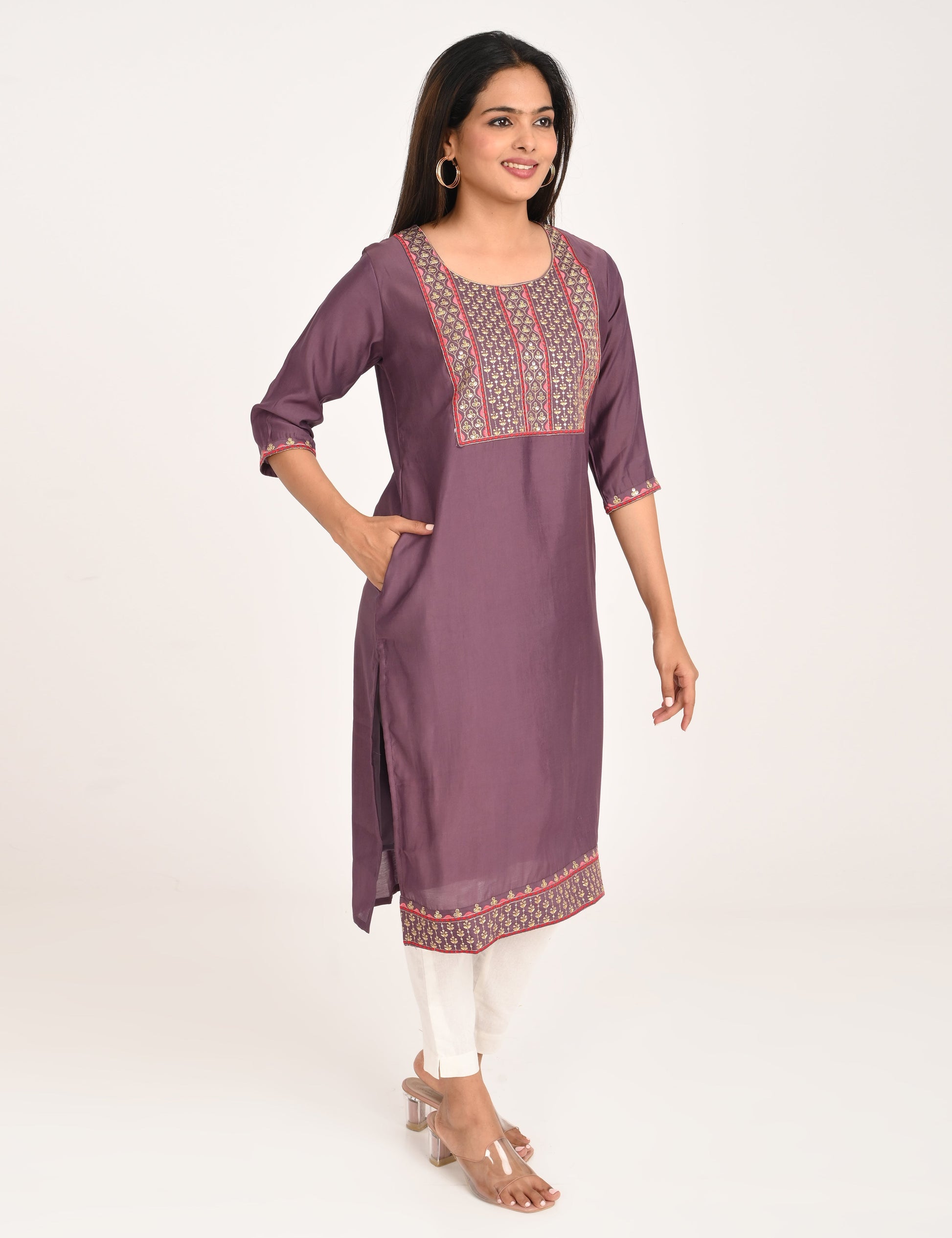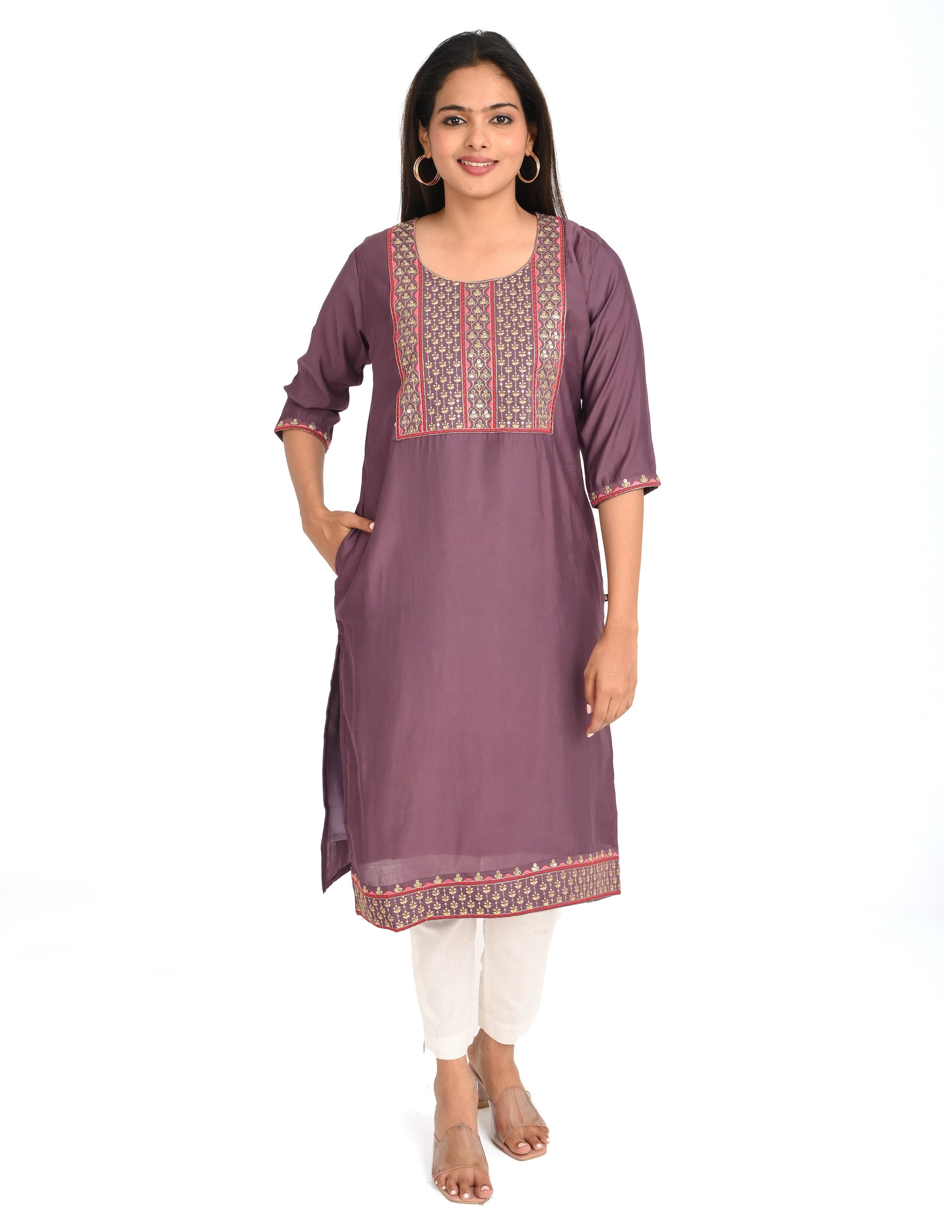 The kurti is adorned with subtle, intricate embroidery that adds a touch of grace and refinement. The small embroidery patterns are thoughtfully placed, creating a harmonious balance that enhances the overall design without overwhelming its simplicity. This design approach makes it versatile, suitable for festive gatherings, casual outings, or even formal office wear.