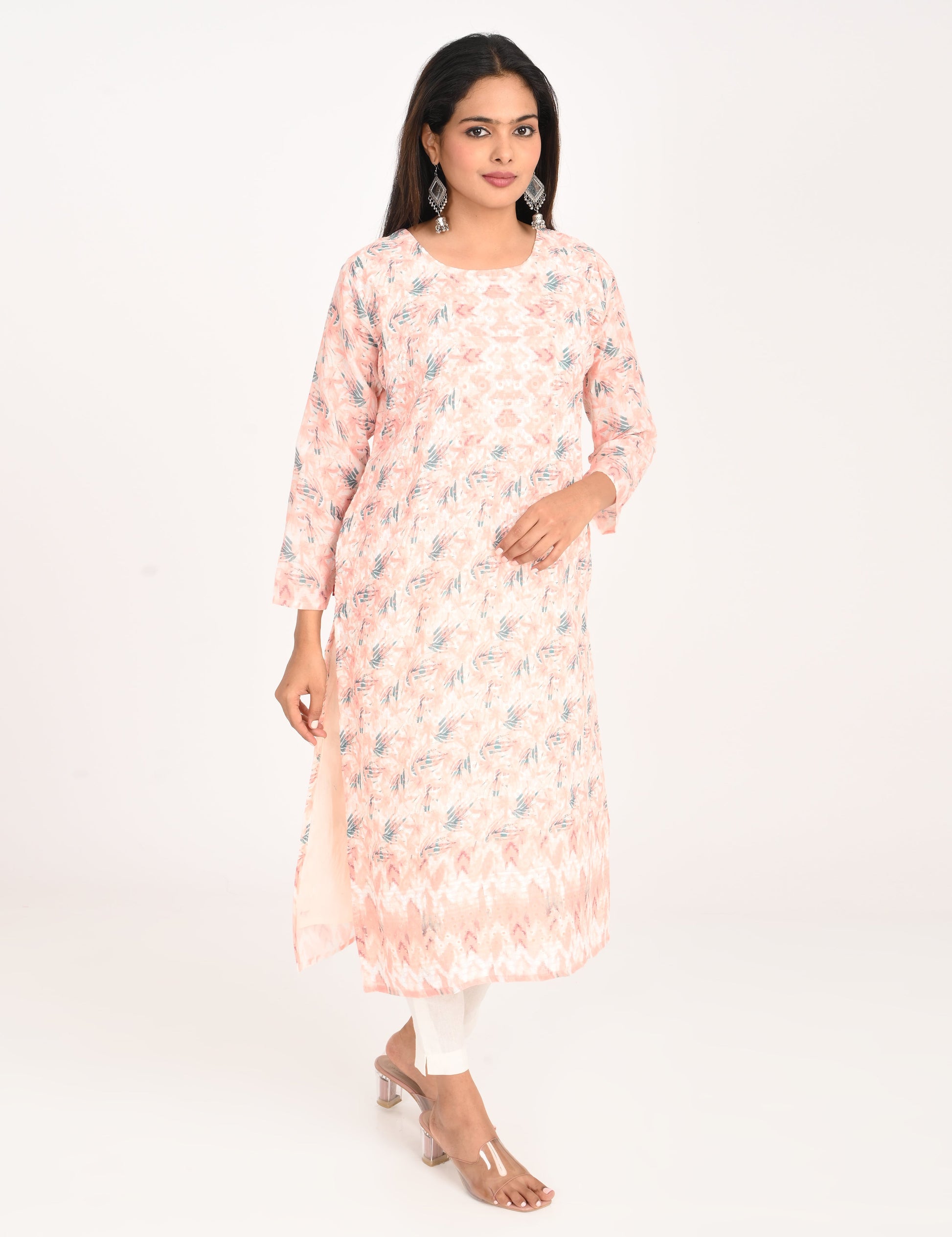 The Onview COTTON CHIKANKARI WORK WITH DIGITAL PRINT is a sophisticated blend of luxurious fabric and delicate craftsmanship, designed to elevate your style effortlessly. Made from premium-quality silk, this kurti boasts a rich texture and an elegant sheen that exudes opulence, making it a perfect choice for special occasions or everyday elegance.