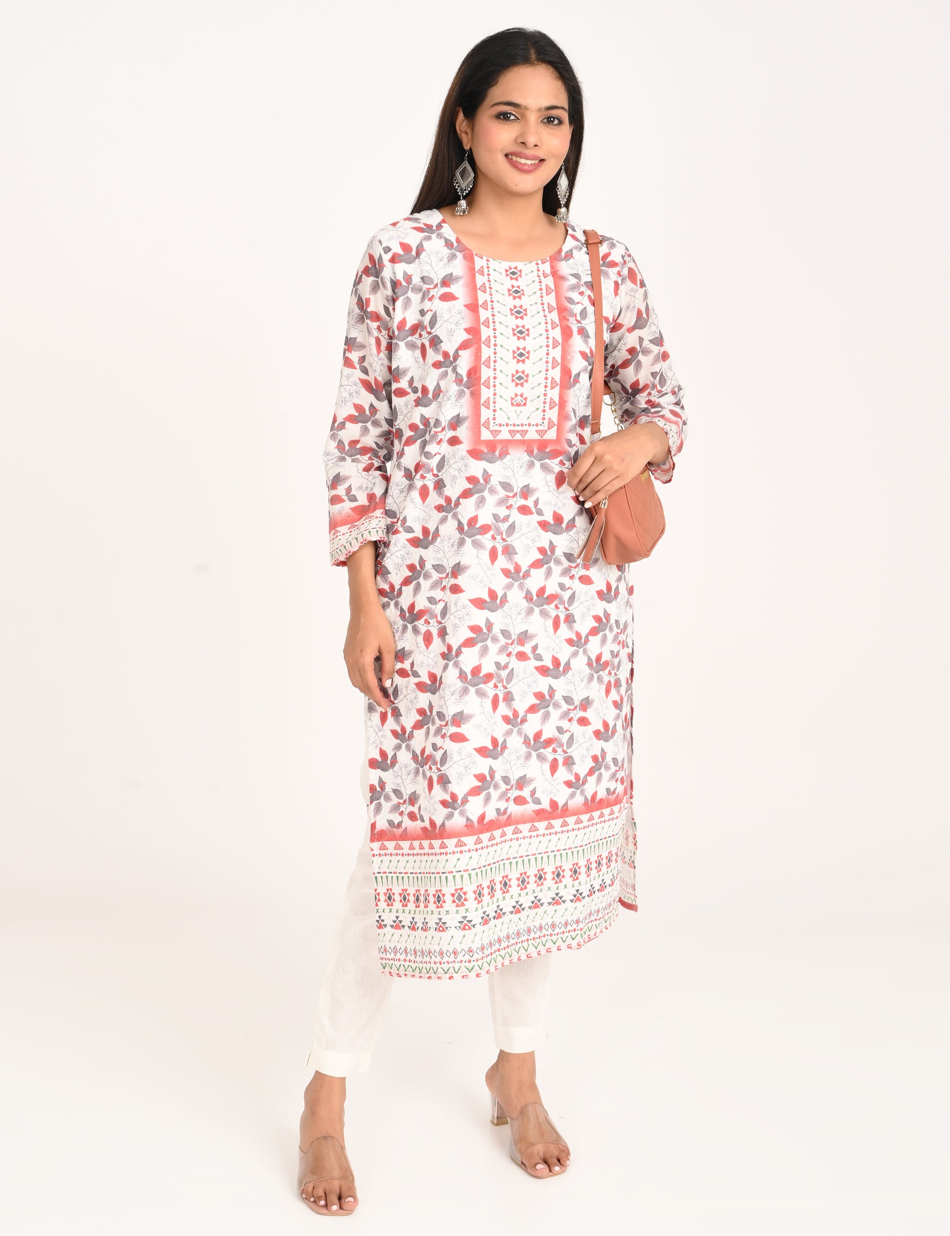 The kurti is adorned with subtle, intricate embroidery that adds a touch of grace and refinement. The small embroidery patterns are thoughtfully placed, creating a harmonious balance that enhances the overall design without overwhelming its simplicity. This design approach makes it versatile, suitable for festive gatherings, casual outings, or even formal office wear.